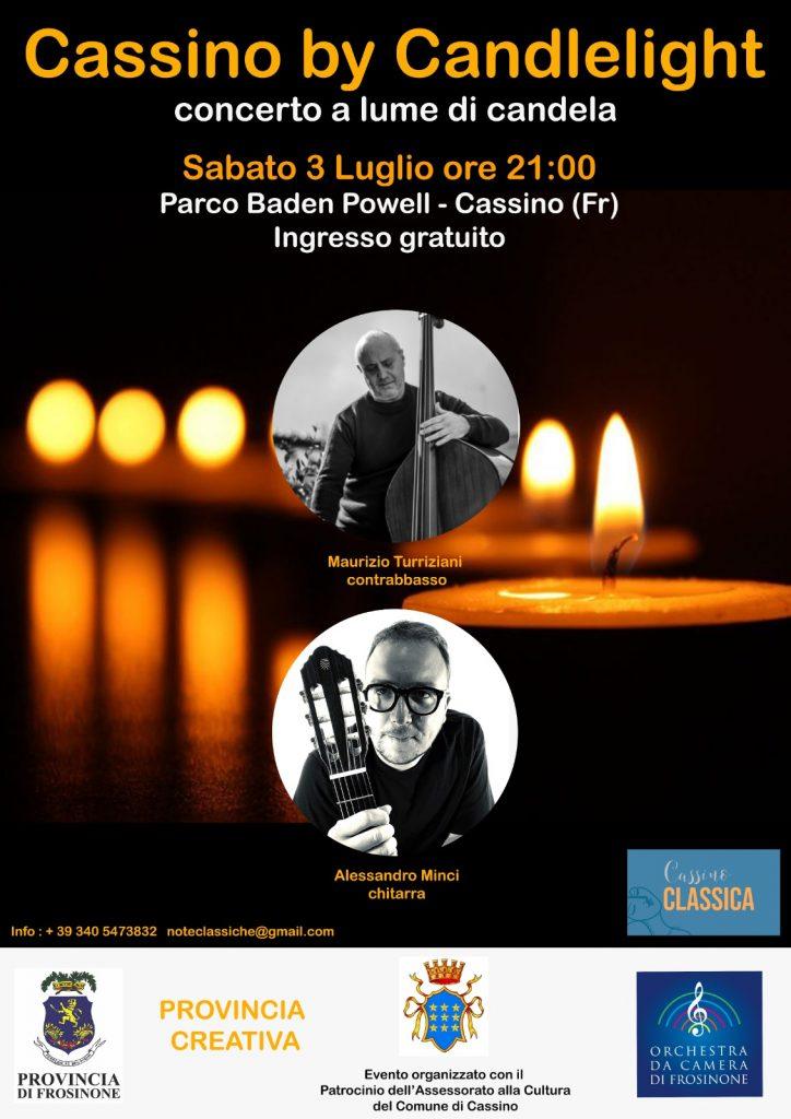 Un concerto a Lume di Candela riporta la grande musica nella città di Cassino. Sabato 3 luglio alle ore 21:00 nell’incantevole cornice del Parco Baden Powell di Cassino , Alessandro Minci (chitarra ) e Maurizio Turriziani (contrabasso) terranno un concerto unico dedicato alle più celebri melodie del XXI secolo riadattate per questo suggestivo organico.