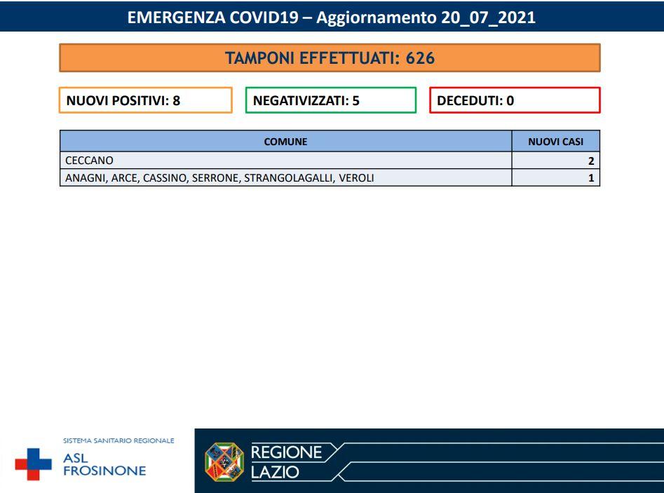 Nelle ultime 24 ore sono stati effettuati 626 tamponi in provincia di Frosinone. Si registrano registrato 8 nuovi casi di positivi al Sars-CoV-2.I negativizzati sono 5. Non si registrano decessi. I casi però sono in aumenti rispetto a ieri. Il presidente della regione Nicola Zingaretti dice: "Basta chiacchiere! Chi ha responsabilità si vada a vaccinare e inviti tutti a farlo. La cultura no vax nel corso di una pandemia è ancora più pericolosa. È fatta di rifiuti espliciti ma anche di furbizie, omissioni, messaggi sbagliati e silenzi. In questi momenti si vede davvero chi è in grado di guidare un grande e straordinario Paese come il nostro verso la libertà dal Covid".