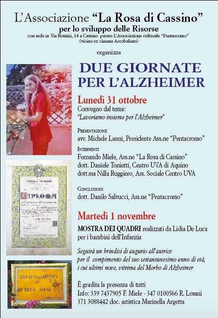 L’Associazione “La Rosa di Cassino”, con sede in via Rossini 14  per lo sviluppo delle Risorse organizza due giornate per l’Alzheimer, a Cassino, presso l’Associazione culturale “Pentacromo” (vicino ex cinema Arcobaleno). L’evento inizierà lunedì 31 ottobre con il convegno dal tema “Lavoriamo insieme per l’Alzheimer”, presentato dall’avvocato Michele Lanni, Presidente dell’Associazione “Pentacromo”.