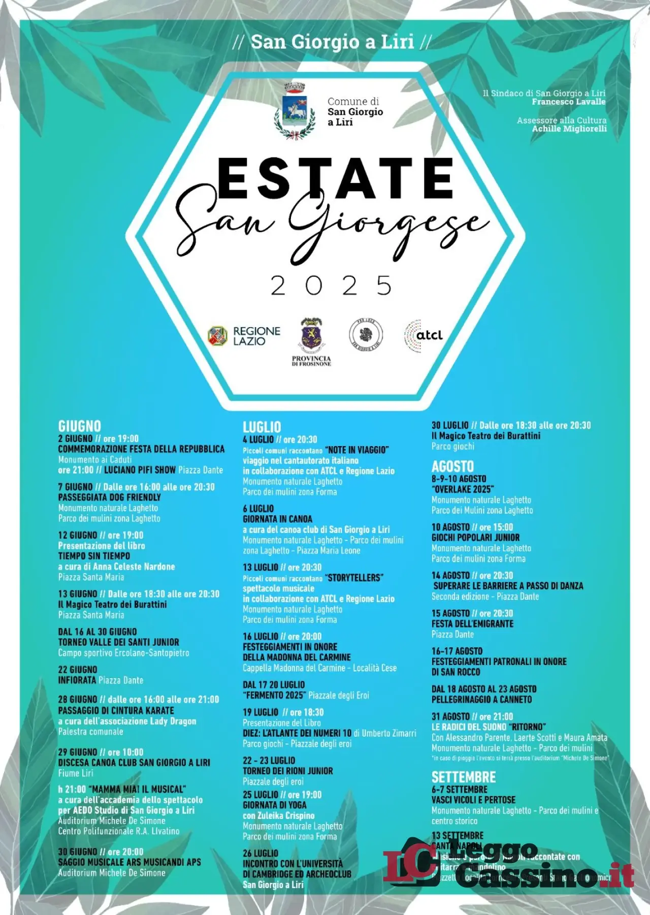 Anche quest’anno tornano i grandi appuntamenti che hanno fatto la storia dell’estate sangiorgese, tra cui Vasci, Vicoli e Pertose, Overlake, Fermento e l’immancabile Torneo dei Rioni, che anima con passione e sportività le serate del paese, celebrando l’orgoglio e il senso di appartenenza dei cittadini di San Giorgio a Liri.