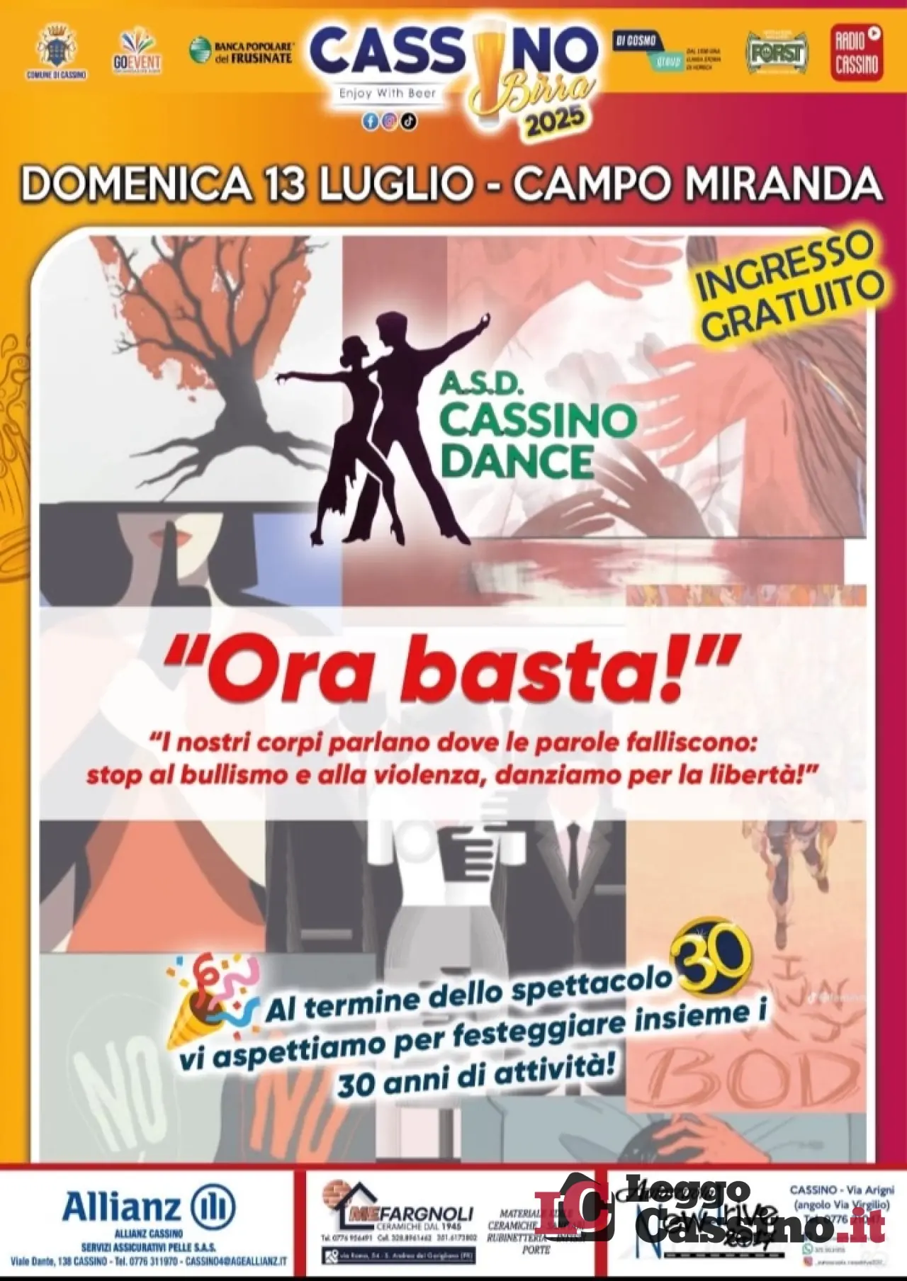 Gran finale questa sera di Cassino Birra 2025 in Campo Miranda con la Cassino Dance. La scuola di Ballo guidata dal Maestro Stefano Tescione nonché presidente FIDESM della Regione Lazio, porterà in scena lo spettacolo "Ora Basta" che trasmetterà un forte messaggio: "I nostri corpi parlano dove le parole falliscono: stop alla violenza e al bullismo danziamo per la libertà". Sarà l'occasione anche per festeggiare tutti insieme i trent'anni di attività della Cassino Dance.