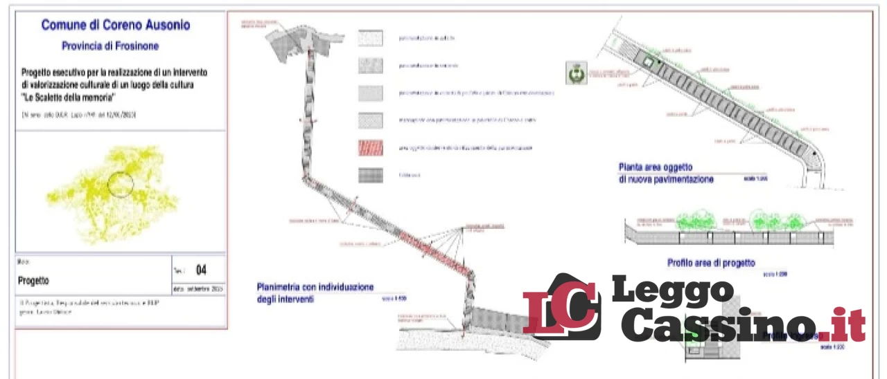 Il Comune di Coreno Ausonio è fra gli enti finanziati dalla Regione Lazio con la determinazione N. G17510 sull’ “Avviso Pubblico per la Valorizzazione del Patrimonio Culturale dei Piccoli Comuni del Lazio - Annualità 2025", con un progetto che riguarda un intervento di valorizzazione culturale di un luogo della cultura: "Le Scalette della memoria", approvato dalla Giunta Comunale di Coreno il 19.09.2025, con Numero 118, senza alcun onere a carico del bilancio comunale per la realizzazione dell’opera.