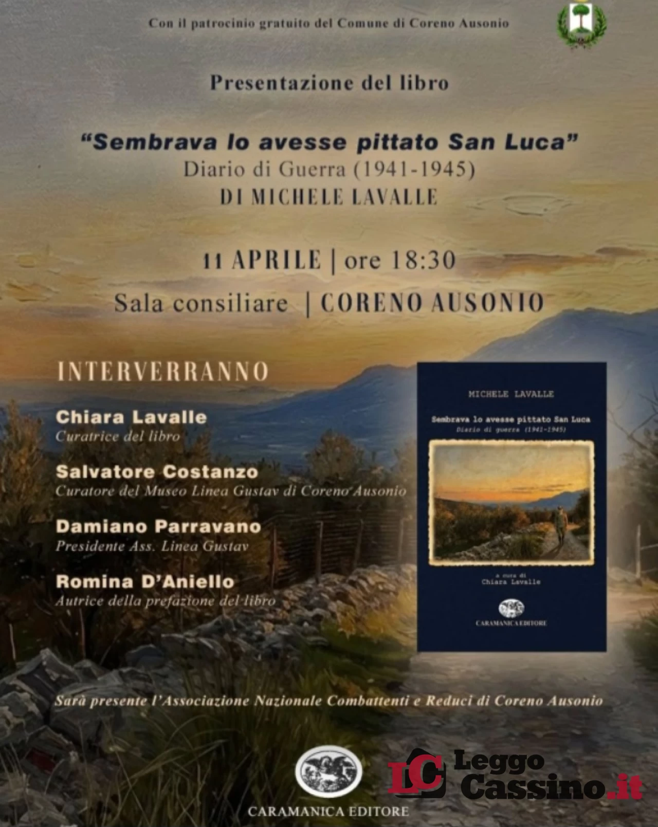 L’evento, che gode del patrocinio gratuito del Comune di Coreno Ausonio, vedrà la partecipazione, oltre che di Chiara Lavalle, di Salvatore Costanzo, curatore del Museo Linea Gustav di Coreno Ausonio e Romina D'Aniello, autrice della prefazione del libro. La serata vedrà inoltre la partecipazione dell’Associazione Nazionale Combattenti e Reduci, a sottolineare il valore istituzionale e civile di una testimonianza che finalmente trova il suo posto nella storia del territorio.