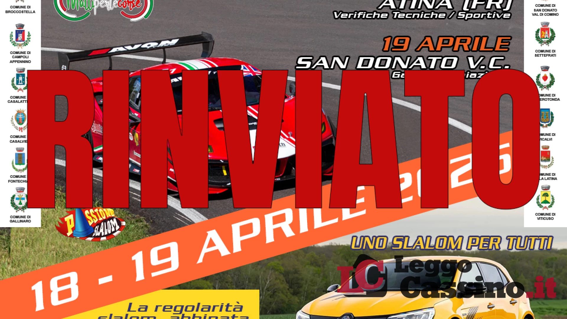 La prima edizione dello slalom “Valle di Comino”, gara nazionale Aci Sport in calendario il 18 ed il 19 aprile prossimi, con partenza e arrivo a San Donato Val di Comino, in