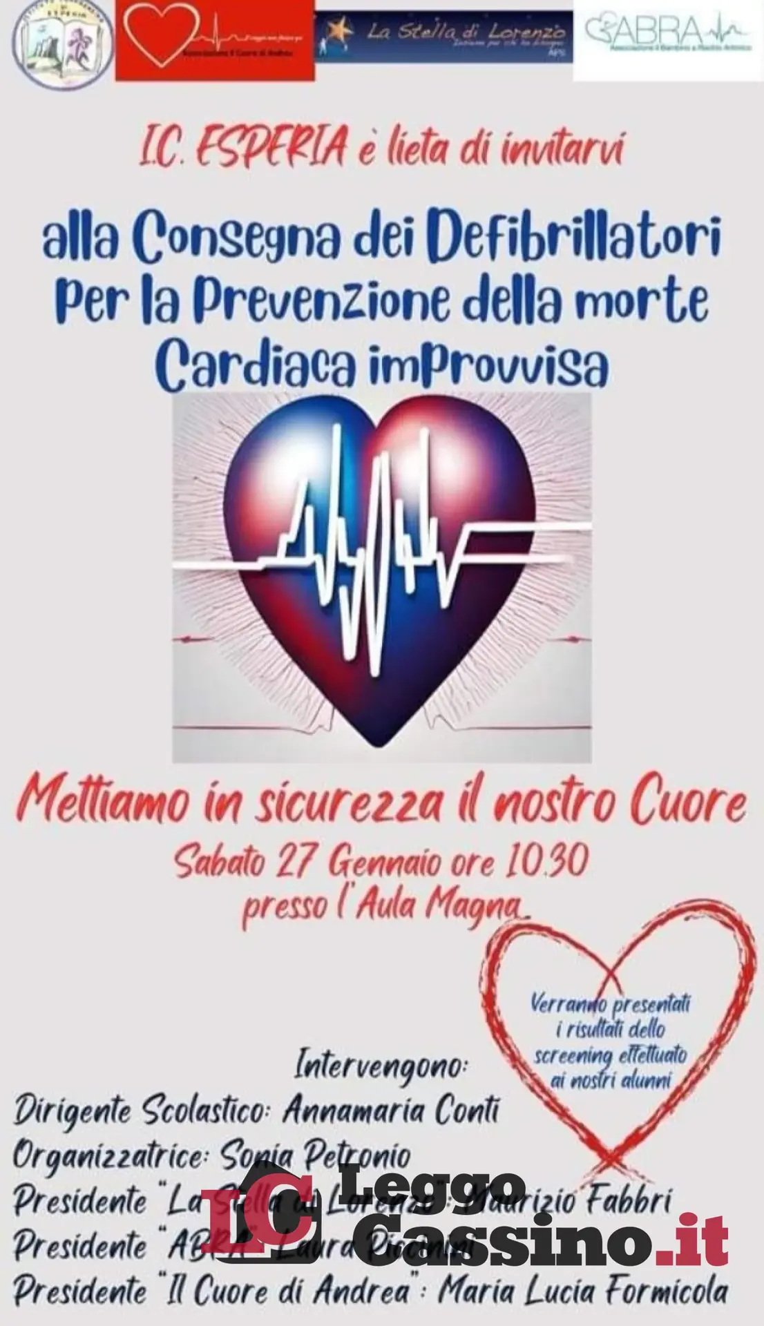 Sabato 27 gennaio alle ore 10.30 saranno consegnati sette defibrillatori semiautomatici all’Istituto Comprensivo di Esperia. L’evento si terrà presso l’Aula Magna della scuola, ed interverranno, il dirigente scolastico Annamaria Conti, l’organizzatrice Sonia Petronio, il presidente “La stella di Lorenzo” Murizio Fabbri, il presidente “ABRA” (Associazione il Bambino a Rischio Aritmico) Laura Piccinini, il presidente “Il cuore di Andrea” Maria Lucia Formicola. In questo modo tutti i plessi scolastici di Ausonia, Coreno Ausonio, Castelnuovo Parano ed Esperia saranno cardio protetti.