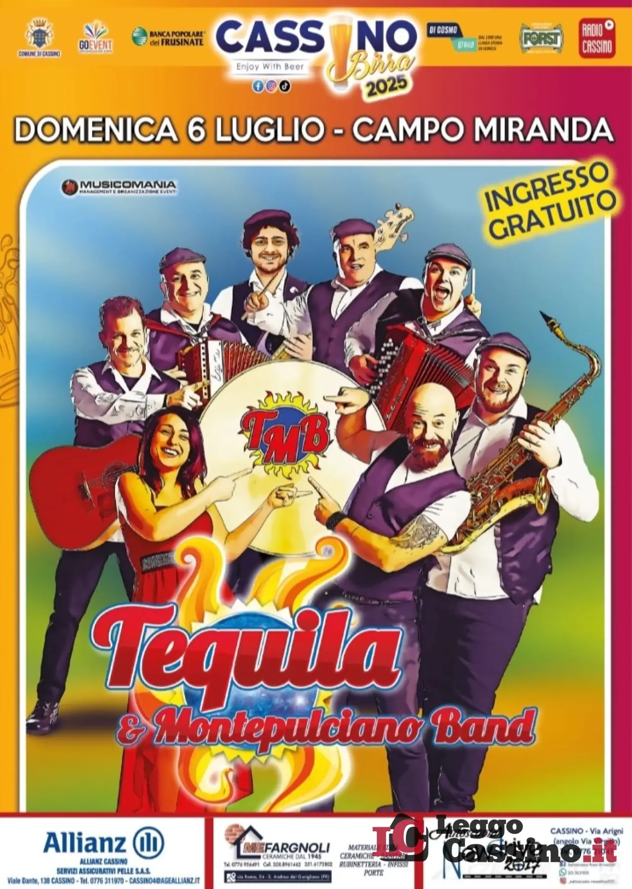 Questa sera, domenica 6 luglio, sul palco di Cassino Birra, in Campo Miranda il ritorno a grande richiesta dei “Tequila & Montepulciano Band”. La band attiva sulla scena musicale con centinaia di concerti all’anno propone un viaggio attraverso il meglio della canzone popolare italiana. L’attuale formazione comprende Matteo Laudadio (voce e percussioni), Simona Di Gregorio (voce), Giada Napoletani (voce), Enrico Benetel (voce e chitarre), Filippo Di Gregorio (voce, tamburelli e sax), Antonio Mancini (fisarmonica), Abramo Cipriani (organetto e tastiere) e Raniero Silvetti (basso). I “Tequila e Montepulciano Band” hanno avuto successo con brani come “Cicirinella Teneva Teneva”, “Oilì Oilà”, “La bottarella” e “Mannaggia lu vinu vinu”.