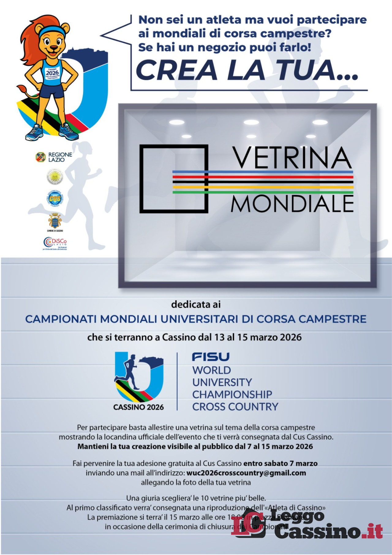 Per partecipare basta allestire una vetrina sul tema della Corsa campestre, mostrando la locandina ufficiale dell’evento che ti verrà consegnata dal CUS Cassino. Mantieni la tua creazione visibile al pubblico dal 7 al 15 marzo 2026. Fai pervenire la tua adesione gratuita al CUS Cassino entro sabato 7 marzo, inviando una mail all’indirizzo: wuc2026crosscountry@gmail.com allegando la foto della tua vetrina. Una giuria sceglierà le 10 vetrine più belle.