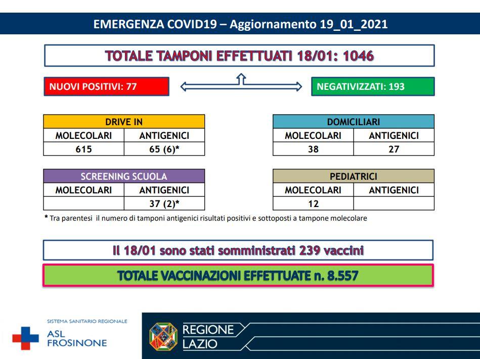 Intanto poco fa è stato diramato il bollettino regionale dei contagi nella regione Lazio: oggi su quasi 13 mila tamponi (+2.891) e oltre 23 mila antigenici per un totale di oltre 36 mila test, si registrano 1.100 casi positivi (+228), 59 i decessi (+43) e +3.150 i guariti. Aumentano i casi e i decessi, mentre diminuiscono i ricoveri e le terapie intensive. Il rapporto tra positivi e tamponi è a 8%, ma se consideriamo anche gli antigenici la percentuale scende a 3%. I casi a Roma città sono a quota 500. Nella Asl di Latina sono 221 i nuovi casi e si tratta di casi isolati a domicilio o con link familiare o contatto di un caso già noto. Si registrano cinque decessi di 69, 76, 78, 82 e 90 anni con patologie. Nella Asl di Frosinone si registrano 77 nuovi casi e si tratta di casi isolati a domicilio, contatti di un caso già noto o con link familiare.