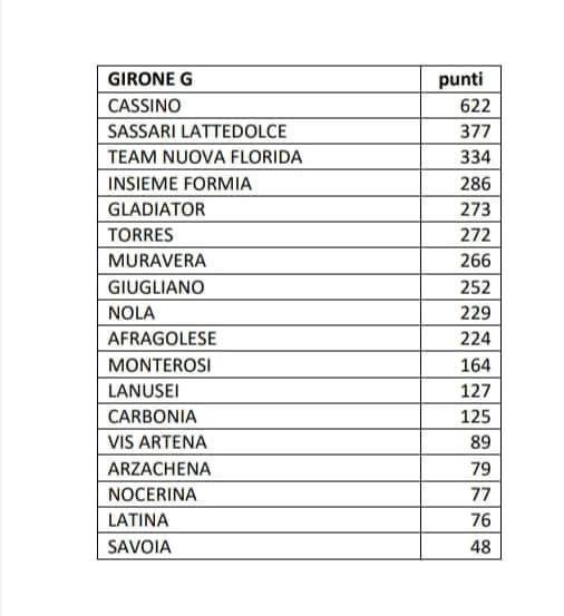 Il Cassino Calcio neanche a dirlo è prima nel girone G di interregionale con 622 punti in classifica, secondo il Sassari con 377, e terzo il team della Nuova Florida con 334 punti all'attivo. La compagine cassinate, inoltre, è terza in graduatoria a livello nazionale.