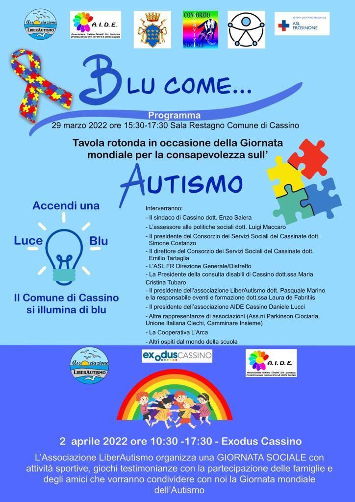 A tal proposito il Comune di Cassino si illumina di blu. Sabato 2 aprile invece dalle ore 10.30 fino alle ore 17.30 l'Associazione LiberAutismo presso Exodus organizza una giornata sociale con attività sportive, giochi e testimonianze con la partecipazione delle famiglie e degli amici che vorranno condividere con loro la giornata mondiale dell'Autismo. Il 2 aprile si illuminerà anche la Rocca Janula su richiesta di Alma Mater nel calendario "le giornate della salute: impariamo ad ascoltare con il cuore"