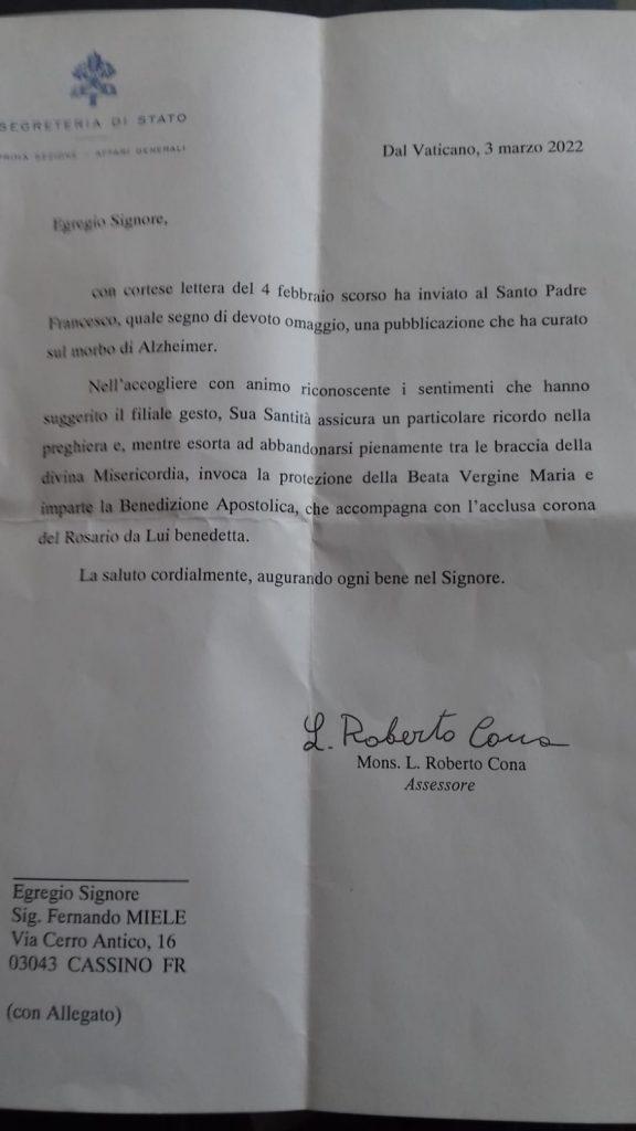 IL FATTO - Fernando Miele di Cassino ha fatto recapitare il suo libro al Pontefice e al Capo dello Stato nel quale racconta la storia della malattia della moglie e i tanti sacrifici di questi anni. Ecco la risposta degli uffici del Quirinale e del Vaticano