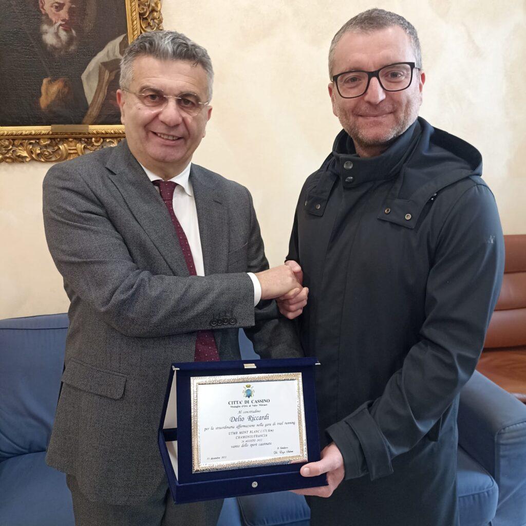E’ stato ricevuto in Comune dal sindaco, questa mattina, il concittadino Delio Riccardi, ingegnere di Stellantis, al quale Enzo Salera ha fatto dono di una targa per la straordinaria affermazione il 26 agosto scorso nella gara di trail running a Chamonix in  Francia. Una fatica di 171 chilometri tra le stupende montagne quali sono le Alpi. “Si tratta dell’equivalente dei mondiali di calcio – ci ha spiegato Riccardi -  Una esperienza che si ripete ogni anno cui si accede dopo severa selezione che afferisce ad altre gare precedenti, con relativo punteggio assegnato”.