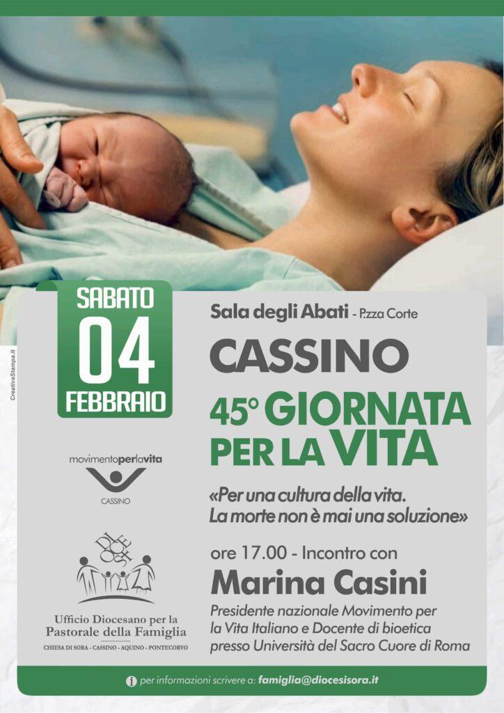 Marina Casini a Cassino per la 45° Giornata per la Vita. Il presidente nazionale del Movimento per la Vita sarà ospite del convegno organizzato dall'Ufficio di Pastorale della famiglia della Diocesi di Sora-Cassino-Aquino-Pontecorvo, previsto per sabato 4 febbraio 2023, alle ore 17.00, presso la Sala degli Abati di Piazza Corte.