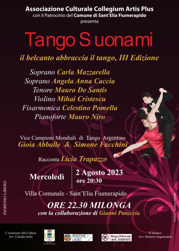 Si terrà mercoledi 2 agosto la III Edizione “Tango Suonami” la Canzone Napoletana incontra il Tango, manifestazione organizzata dall’Associazione culturale Collegium Artis Plus, con il patrocinio del Comune di S. Elia fiumerapido e il supporto di Banca Popolare del Cassinate. Mercoledi 2 agosto, a partire dalle ore 20.30, la magia della commistione tra il tango e la musica napoletana. A partire dalle 22.30, poi, la Milonga, con la collaborazione di Gianni Paniccia. Ad esibirsi i soprani Carla Mazzarella e Angela Anna Caccia e il tenore Mauro De Santis. Al violino Mihai Cristescu, alla fisarmonica Celestino Pomella, al Pianoforte Mauro Niro. Ad impreziosire la manifestazione anche i Vice Campioni Mondiali di Tango Argentino Gioia Abballe & Simone Facchini.