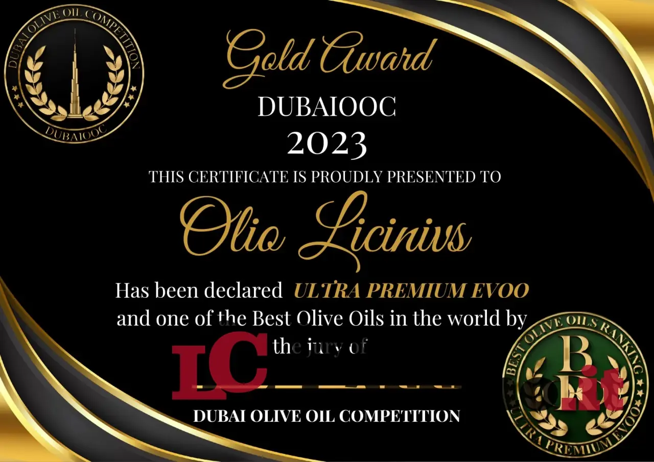 L’olio extra vergine d’oliva Licinivs, al 1° posto per la miglior cultivar (Aurina  autoctona del piccolo agro di Venafro) e per il migliore olio al mondo. Per il Licinius il 2023 è stato un anno indimenticabile con oltre ventidue premi. L’eccellenza italiana ed  internazionale ha conquistato Dubai.