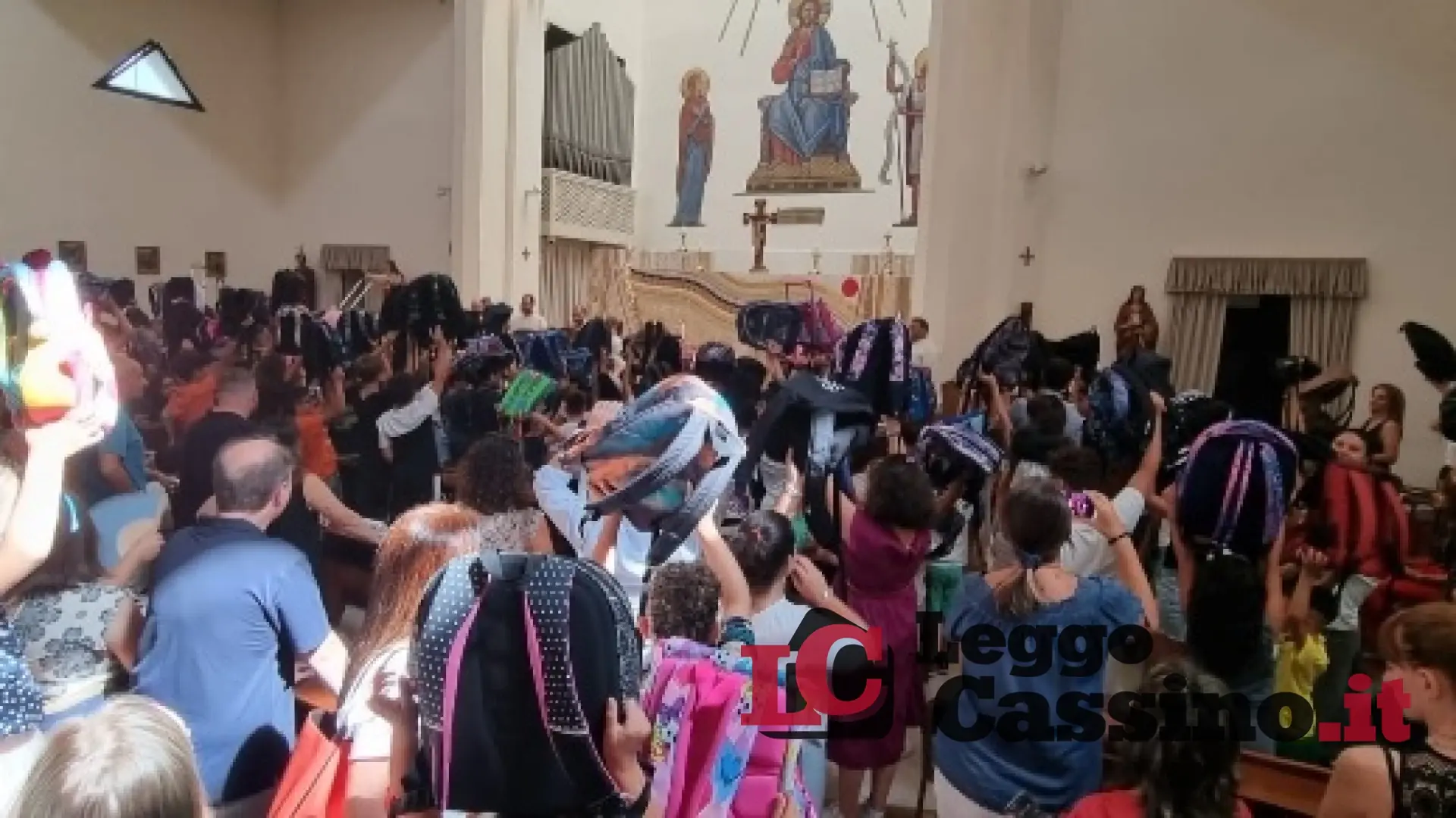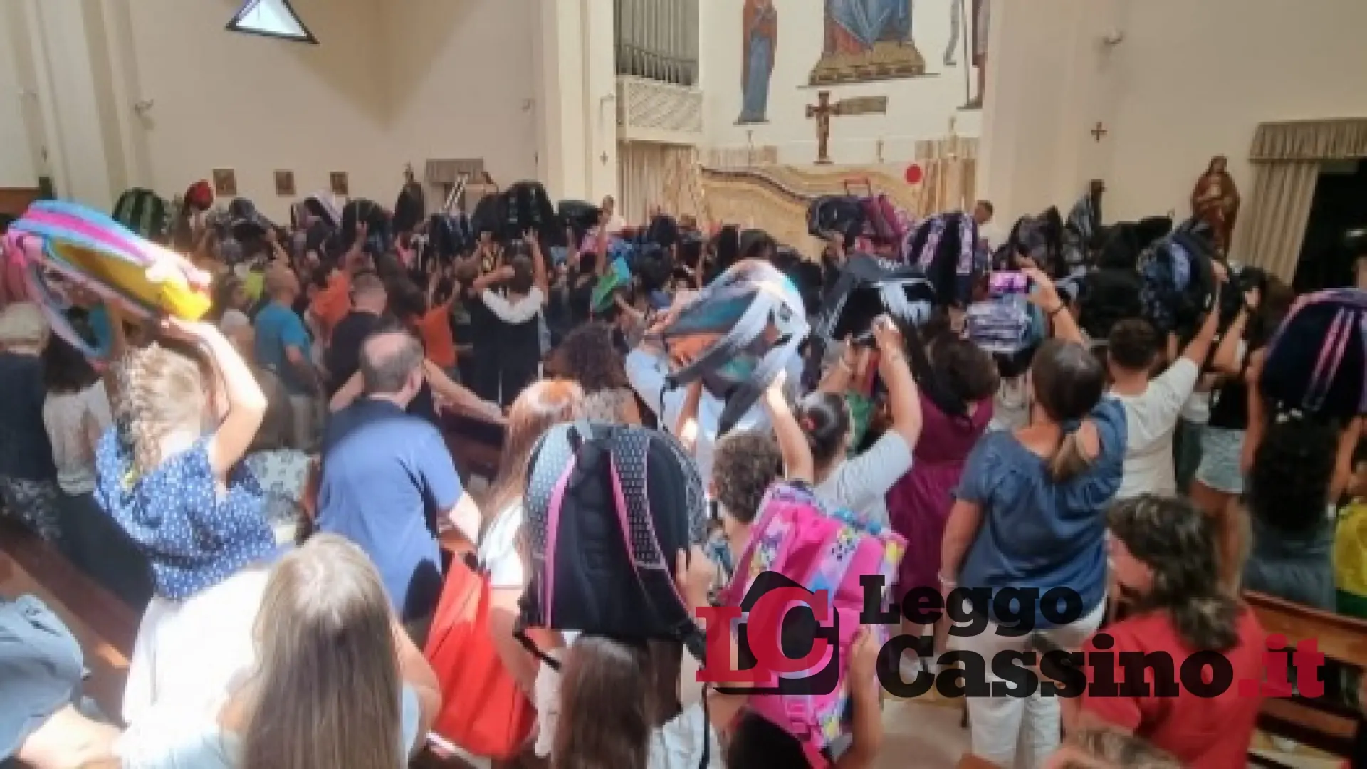 Al termine della celebrazione, bambini e ragazzi hanno alzato in aria gli zaini per la benedizione.