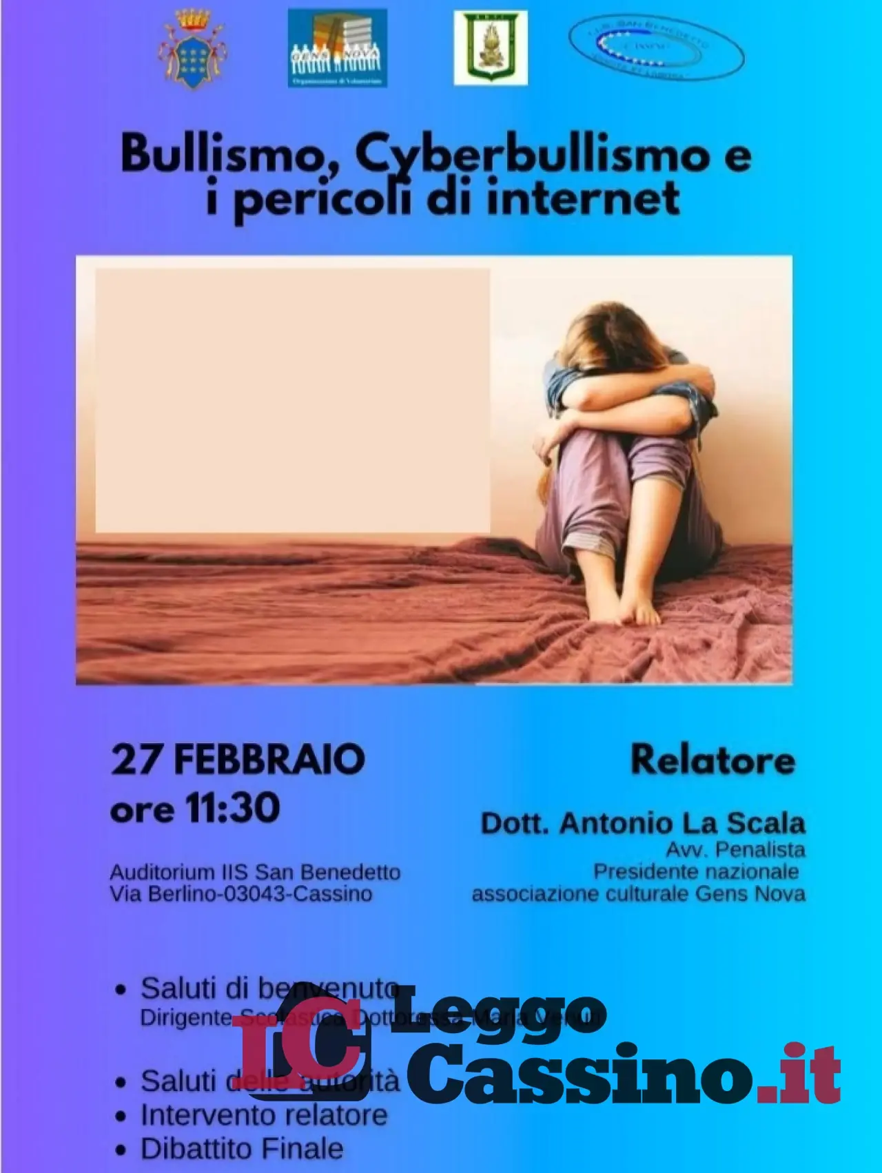 “Bullismo, Cyberbullismo e i pericoli di internet” questo il titolo del convegno che si terrà il 27 febbraio alle ore 11.30 presso l’auditorium dell’Istituto San Benedetto, presso la sede di via Berlino.