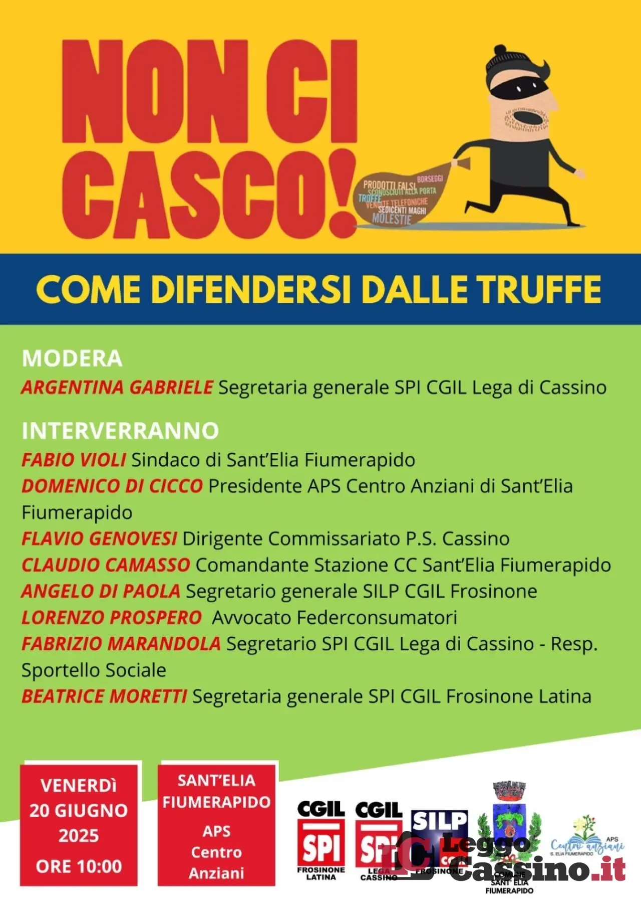 Proprio in questa direzione va il convegno che si terrà venerdì 20 giugno, alle ore 10, presso il centro anziani di Sant’Elia Fiumerapido, organizzato dallo SPI CGIL di Cassino, in collaborazione con la segreteria provinciale del SILP CGIL, sul fenomeno delle truffe. L’evento è patrocinato dal Comune di Sant’Elia Fiumerapido.
