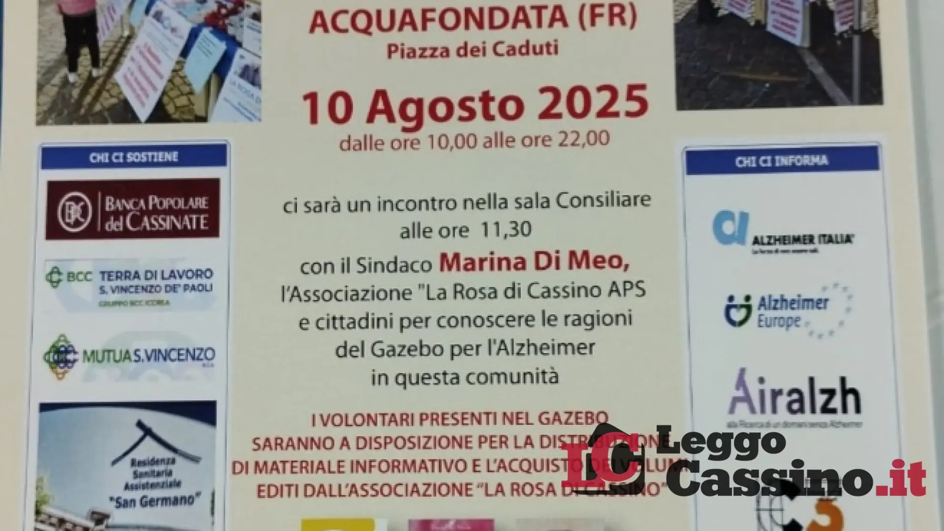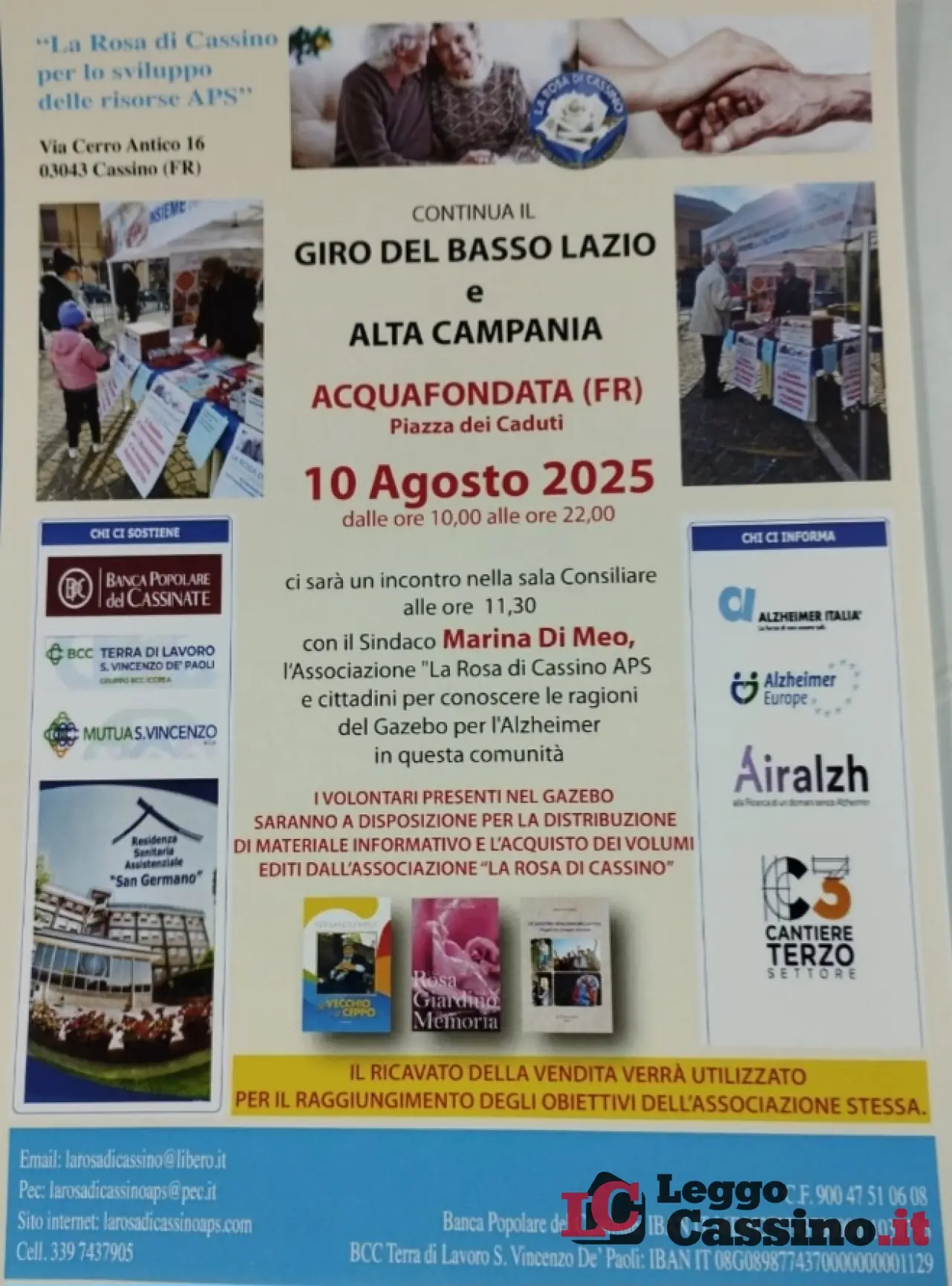 Dopo i tanti incontri e convegni sul tema della Demenza svolti dalla Rosa di Cassino APS già nelle comunità di Cassino, Mignano Monte Lungo, Atina, Viticuso , Pignataro Interamna, Ausonia, S.Elia Fiume Rapido e Vallemaio, è la volta della bellissima comunità di Acquafondata. In piazza dei Caduti l’incontro si terrà domenica 10 agosto dalle ore 10 alle ore 22. Nella sala consiliare invece alle ore 15.30 con il sindaco Marina Di Meo, l’Associazione La Rosa di Cassino APS ed i cittadini per conoscere le ragioni del Gazebo per l’Alzheimer, in questa comunità. I volontari presenti nel gazebo saranno a disposizione per l’acquisto dei volumi editi dall’associazione “La Rosa di Cassino”.