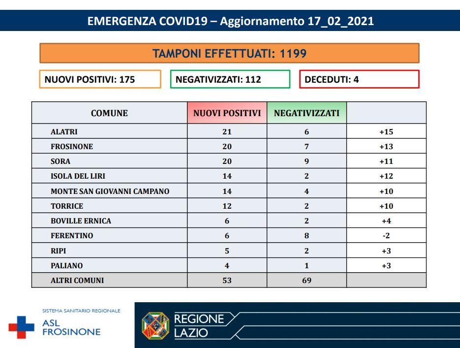 Nella giornata del 17 febbraio 2021 in Ciociaria sono stati effettuati 1199 tamponi: 175 nuovi postivi e 112 negativizzati. Sono stati registrati quattro decessi nelle ultime 24 ore di residenti nella Provincia di Frosinone: un uomo di 73 anni residente a Ceprano, un uomo di 90 anni residente a Pico, una donna di 85 anni residente a Cassino e una donna di 74 anni residente a Pontecorvo.