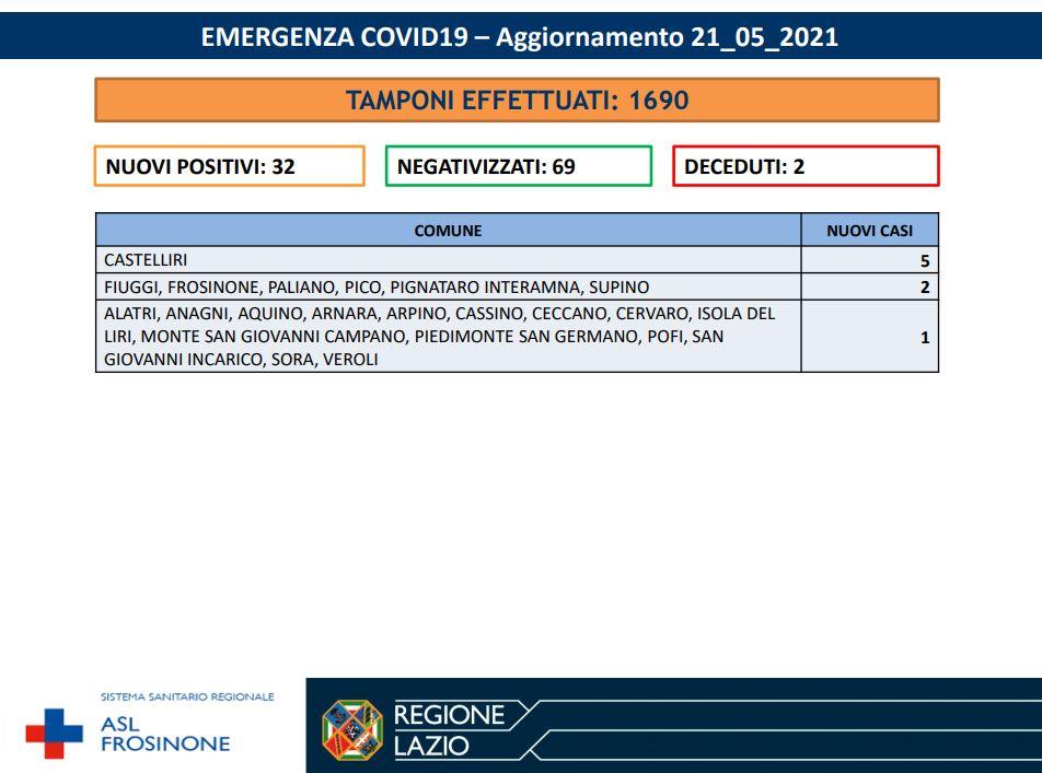 Nelle ultime 24 ore sono stati effettuati 1690 tamponi in Ciociaria. Contagi ancora bassi: si registrano 32 nuovi casi di positivi al Sars-CoV-2. Sono 69 i negativizzati. Due i decessi di persone residenti in provincia di Frosinone, entrambi del Cassinate. una donna di 69 anni di Roccasecca e una donna di 70 anni di Cassino.