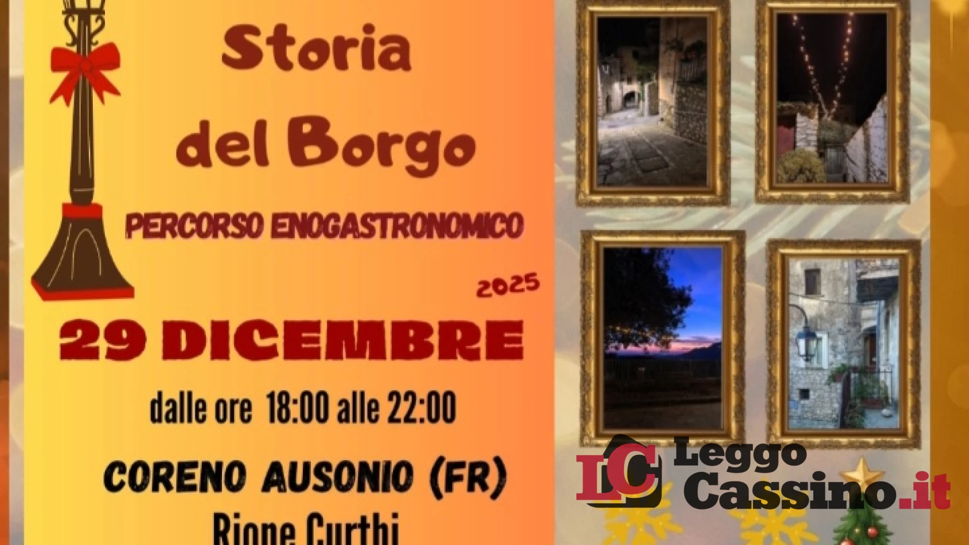 Si terrà oggi lunedì 29 dicembre a Coreno Ausonio “Sapori e storia del borgo” a partire dalle ore 18 in zona Curthi (centro storico). Spettacoli, animazione per bambini, rappresentazioni teatrale e percorso enogastronomico con prodotti tipici locali.