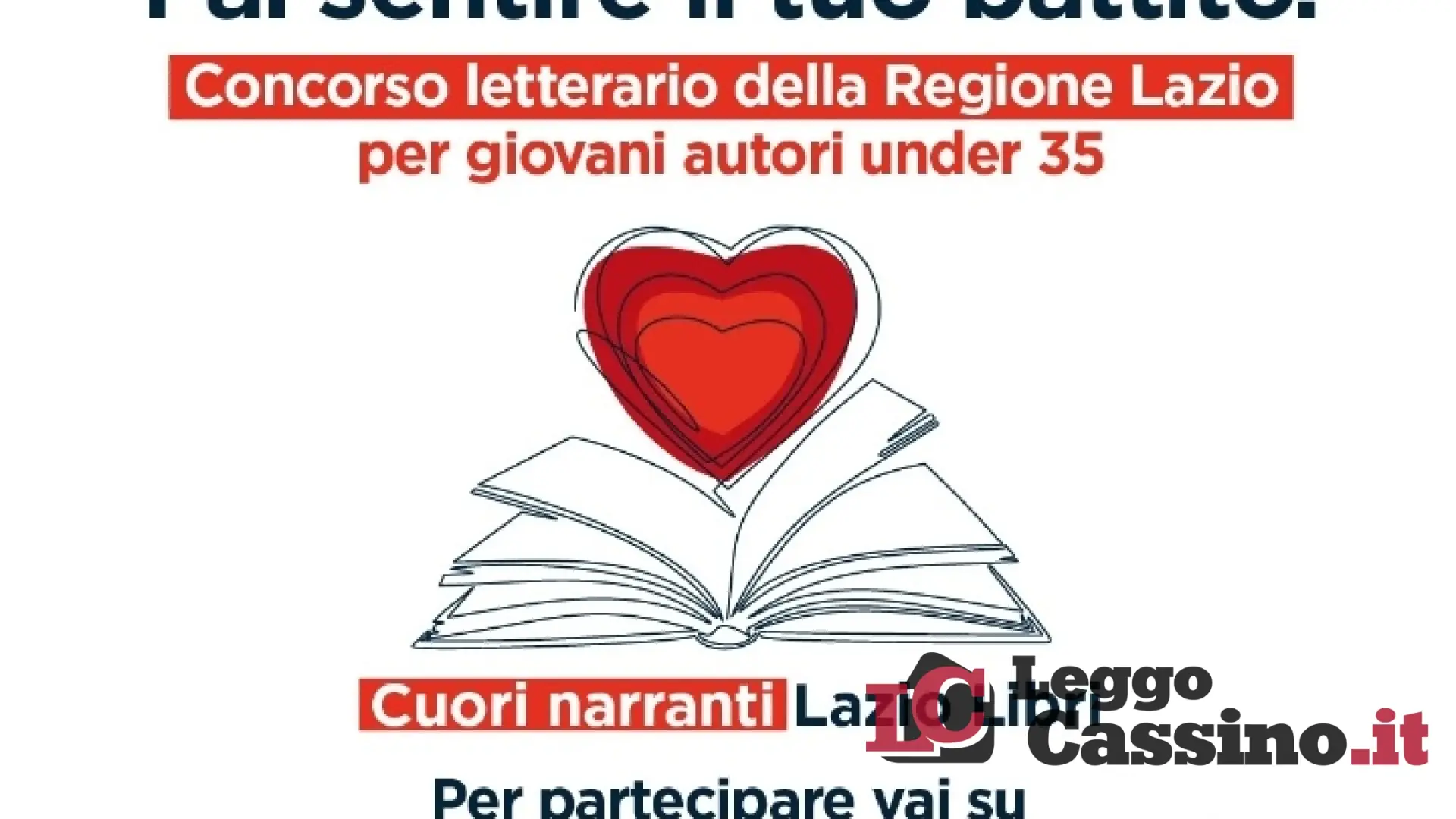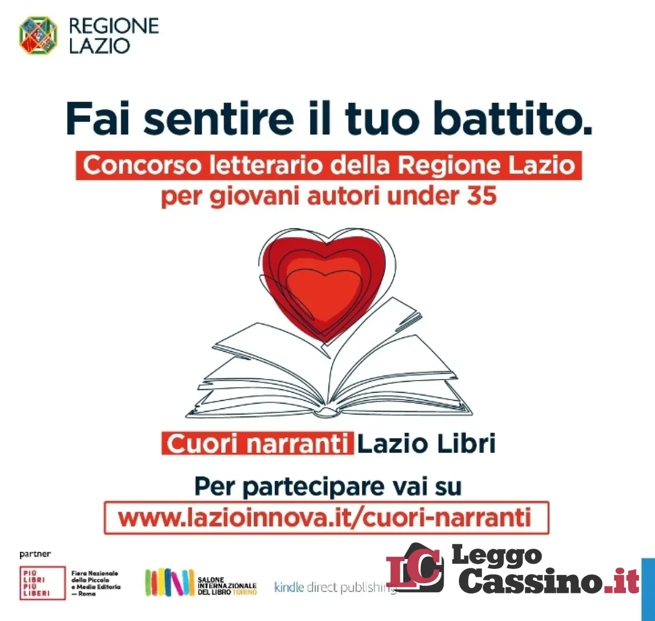 La Regione Lazio, attraverso Lazio Innova e nell’ambito del progetto “Lazio Libri”, annuncia il lancio del concorso letterario “Cuori narranti”, un’iniziativa rivolta a giovani autori tra i 14 e i 35 anni (non compiuti alla data di scadenza del bando), residenti o domiciliati nel territorio regionale. Partner dell’iniziativa: Più libri più liberi, Salone Internazionale del Libro di Torino e Amazon.