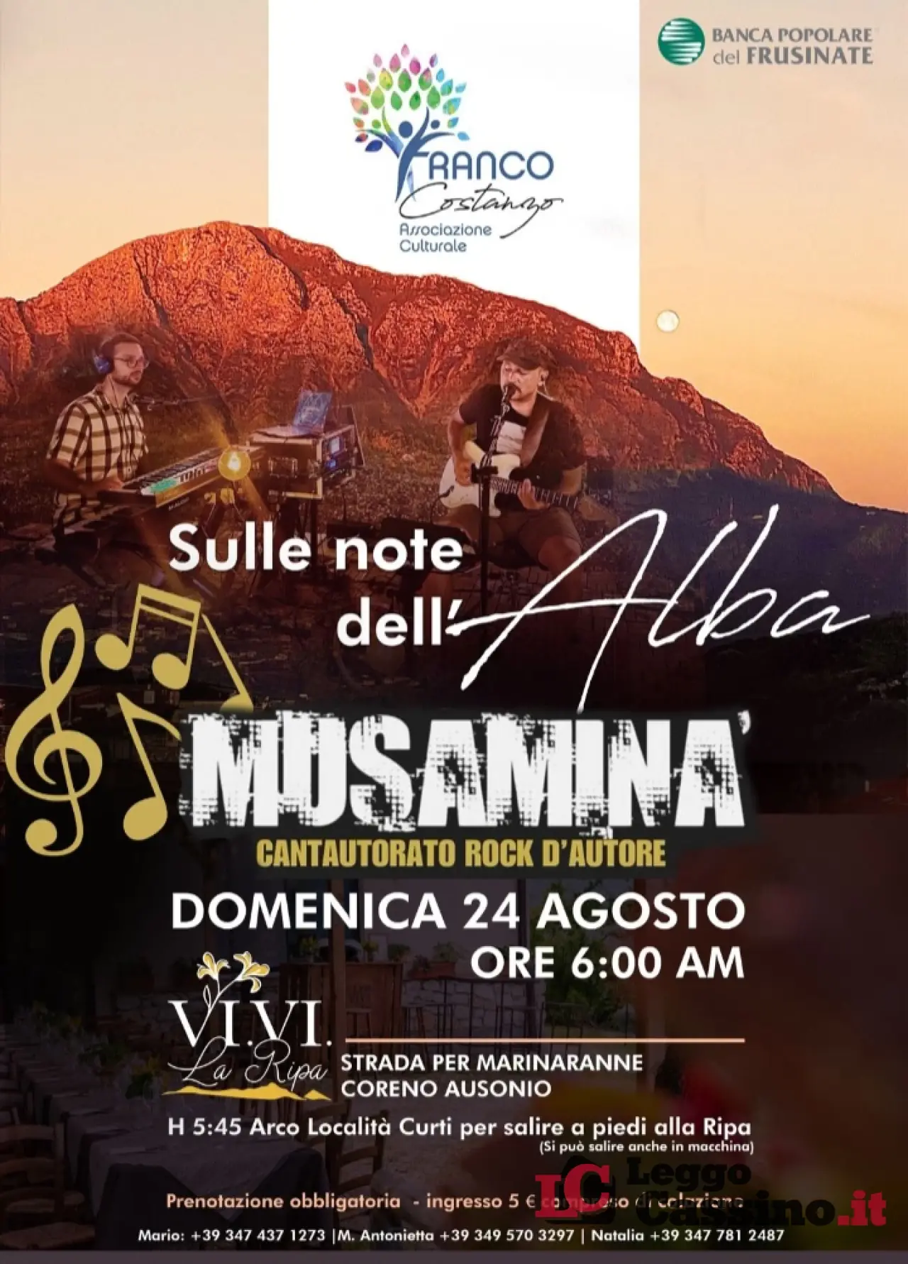Domenica 24 agosto Coreno Ausonio sarà teatro di un evento unico e suggestivo. La location è davvero speciale: Vi.vi la Ripa, un posto divino con una vista mozzafiato. Il concerto dei Musaminà avrà inizio alle 6.00 A.M. e ci accompagnerà nel momento più magico: il sorgere dell'Alba! Insieme, vedremo il nuovo giorno illuminarsi sul monte Fammera e brillare sul Golfo di Gaeta. Un'esperienza indimenticabile che unirà musica, natura e bellezza.