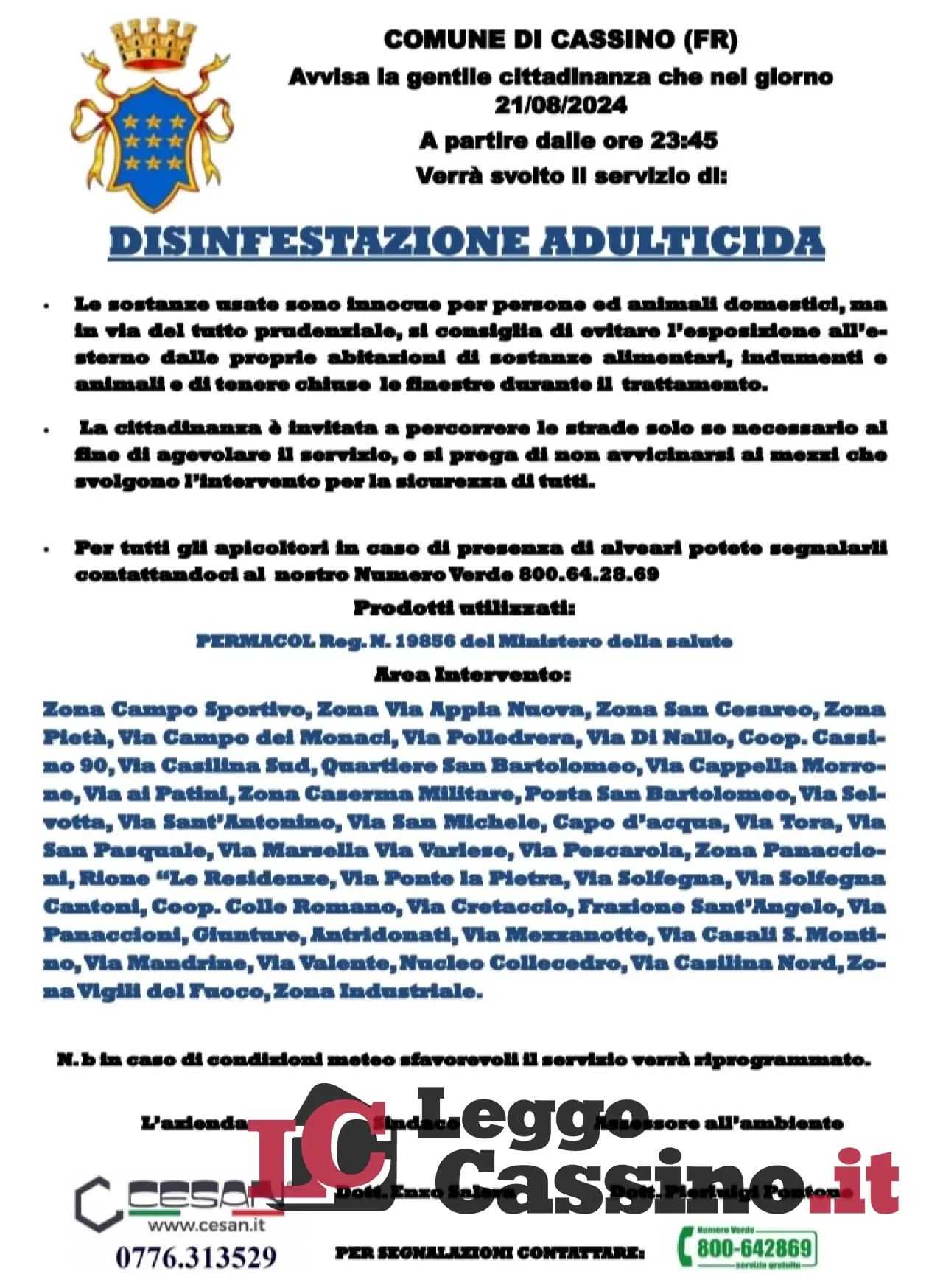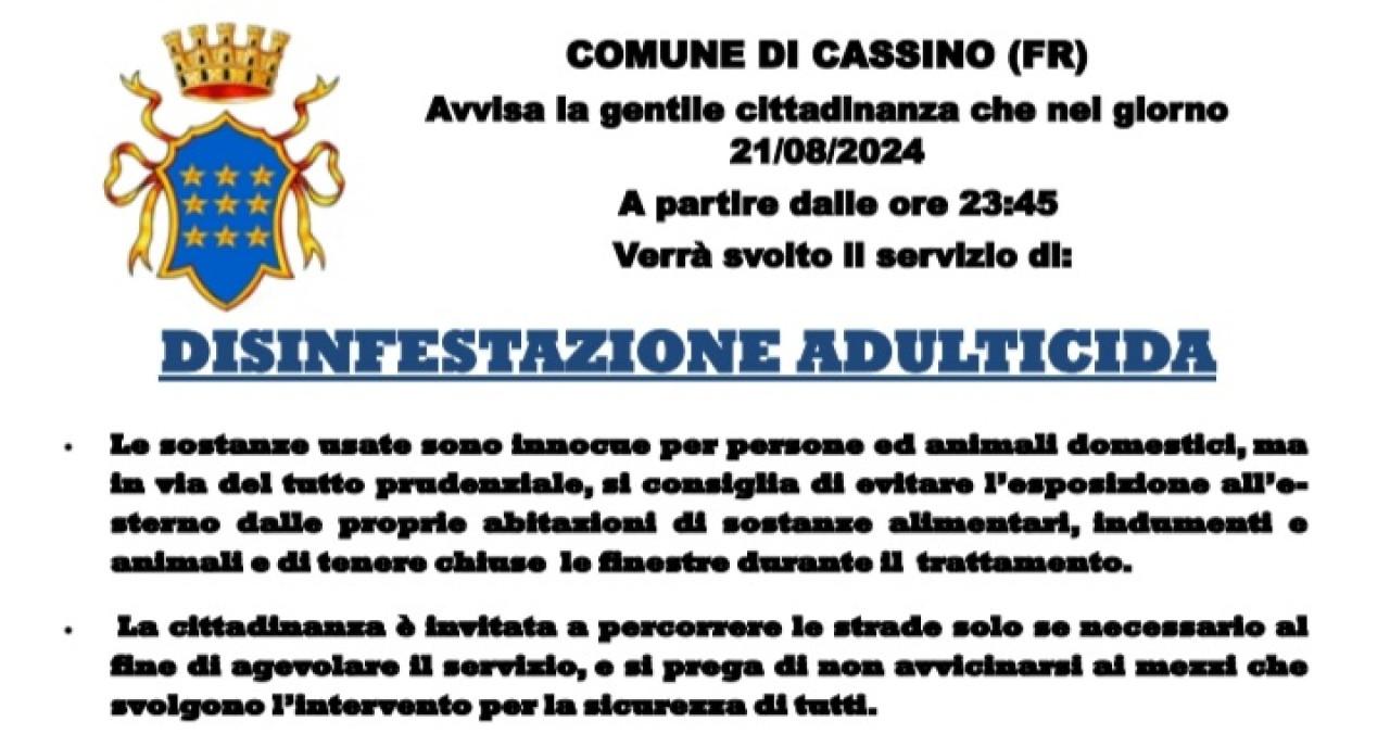 L'Ufficio Ambiente del Comune di Cassino informa la cittadinanza che lunedì 19 e mercoledì 21 agosto, su tutto il territorio, verrà effettuata la disinfestazione adulticida a partire dalle ore 23,45.