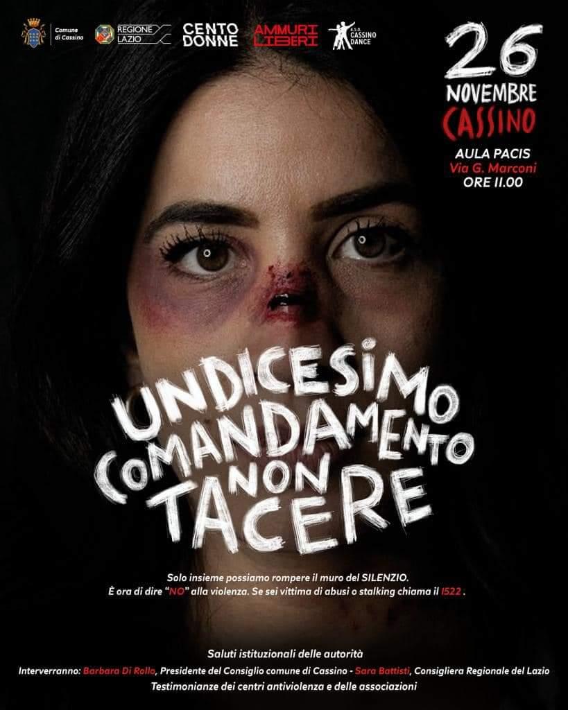 Sabato 26 novembre ore 11:00 presso Aula Pacis “UNDICESIMO COMANDAMENTO NON TACERE”. Un evento organizzato per gridare forte il NO alla violenza sulle donne. Un'occasione per un incontro-dibattito con le istituzioni un modo per ricordare chi vive nella paura e per dare coraggio alle donne che vorrebbero parlare.