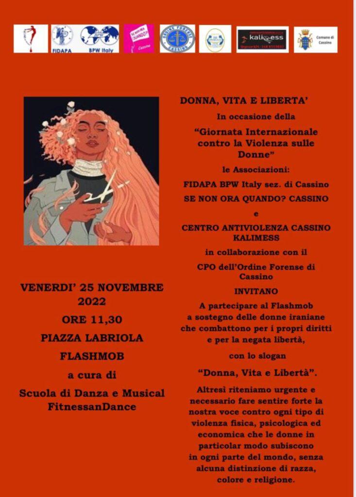 Le associazioni Fidapa BPW Italy sezione di Cassino, "Se non ora quando" e il Centro Antiviolenza Kalimess Cassino in collaborazione con il CPO dell'Ordine Forense di Cassino con lo slogan "Donna, Vita e Libertà"invitano a partecipare al Flashmob a cura della Scuola di Danza e Musical "Fitnessan Dance" a sostegno delle donne iraniane che combattono per i propri diritti e per la negata libertà, in piazza Labriola alle ore 11.30.