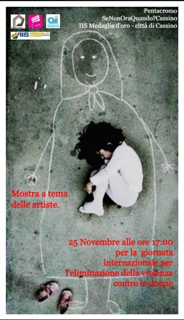 Venerdi 25 novembre ore 17:00, presso la sede Pentacromo in Via Rossini 14: “GIORNATA INTERNAZIONALE PER L’ELIMINAZIONE DELLA VIOLENZA SULLE DONNE”. Una mostra a tema, organizzata da “Se non ora quando?” in collaborazione con la scuola IIS Medaglia d’oro - Citta’ di Cassino e l’associazione Camminare Insieme, per dare voce alle donne tramite i colori. La mostra potrà essere visitata fino a sabato 27 novembre alle ore 19. Si tratta di una mostra contro la violenza sulle donne ed orfani speciali, un progetto pedagogico e di comunicazione nato da un’idea di Marinella Argetta. Lo scopo è quello di sensibilizzare i giovani e fornire loro alcuni strumenti culturali e cognitivi per contribuire alla prevenzione del fenomeno. Parteciperanno le artiste: Angelina Russo, Alida Nardone, Assunta Iorio, Brunella Ferrari, Barbara Trani, Leandra Cuzzocrea, Licia Trapazzo, Marinella Argetta, Marisa Cozzini, Melanie Tullio, Patrizia Scognamiglio, Rocchetta Carnevale, Sara Santodonato, Kay de Lautour.