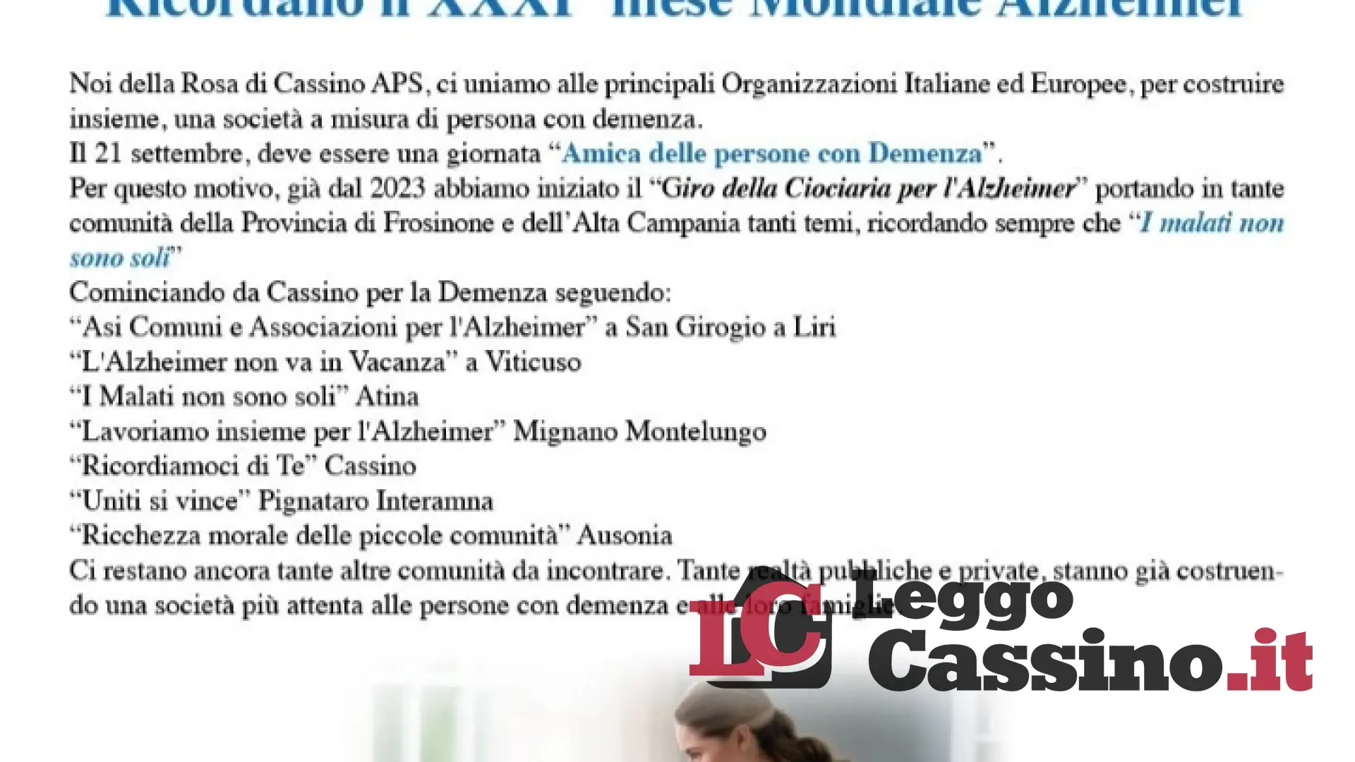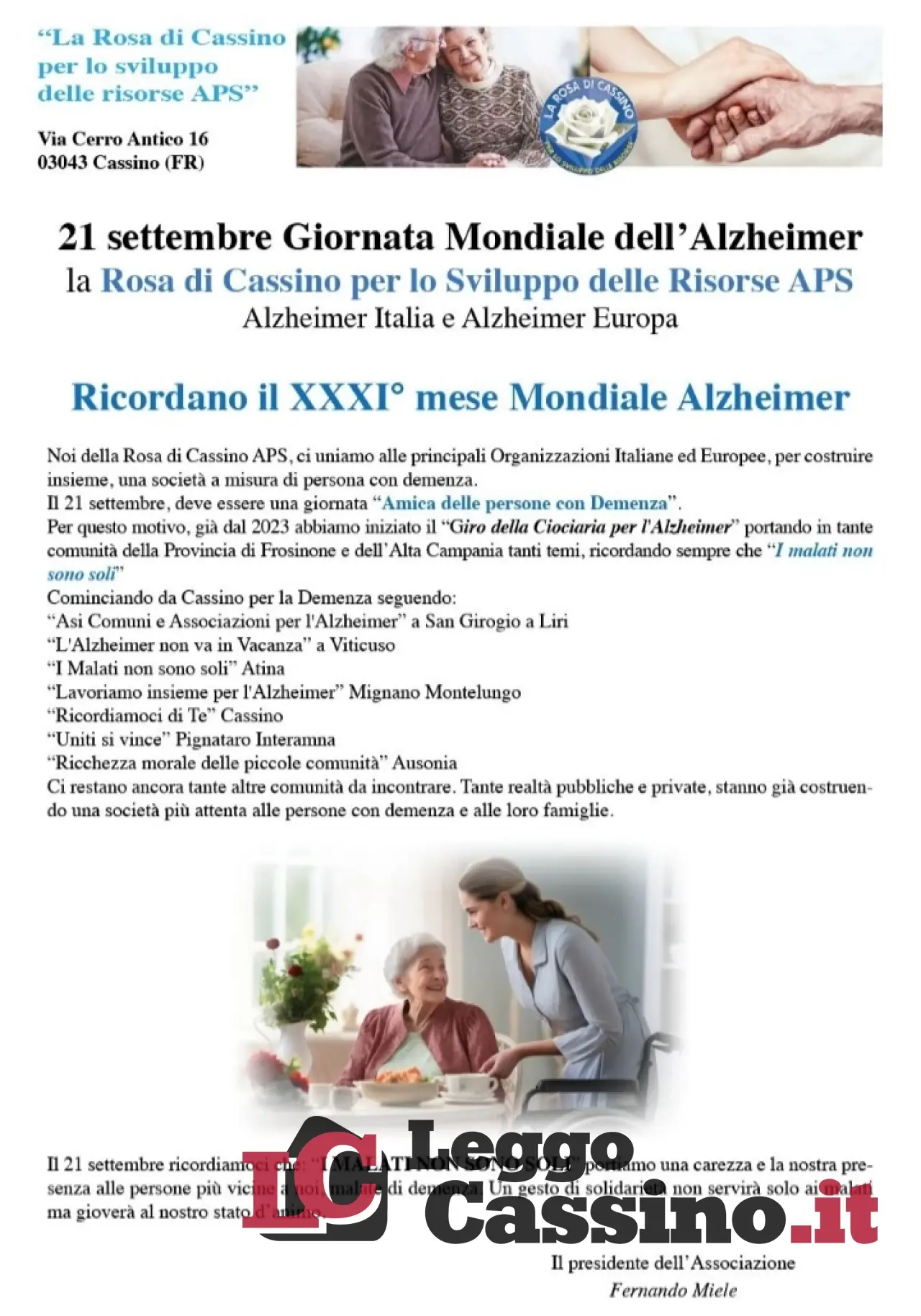 Il 21 settembre giornata mondiale dell'alzheimer. L'associazione la Rosa di Cassino per lo sviluppo delle risorse APS Alzheimer Italia e Alzheimer Europa,  ricorda il 31esimo mese mondiale dell'alzheimer. "Noi della Rosa di Cassino APS  - spiega il presidente Fernando Miele  - ci uniamo alle principali organizzazioni Italiane ed europee per costruire insieme una società a misura di persone con demenza. Il 21 settembre deve essere una giornata amica delle persone con demenza per questo motivo già dal 2023 abbiamo iniziato il giro della Ciociaria per l'Alzheimer, portando in tante comunità nella provincia di Frosinone e dell'alta Campania tanti temi ricordando sempre che i malati non  sono soli.