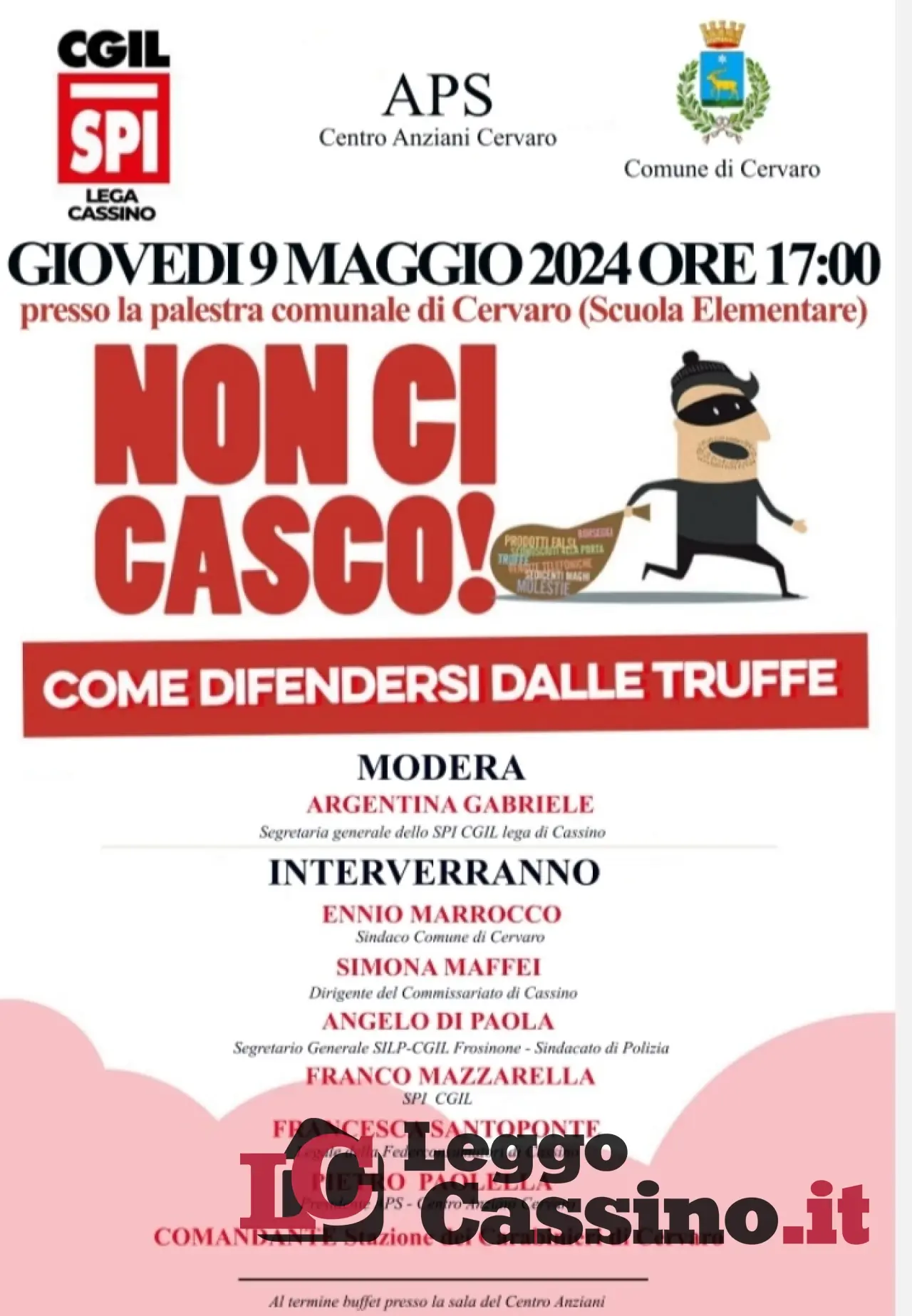 "Io non ci casco" come difendersi dalle truffe, questo il titolo del convegno che si terrà domani, giovedì 9 maggio, presso la palestra comunale di Cervaro (scuola elementare) alle ore 17. L'evento dal tema molto attuale, in quanto le truffe sono in continuo aumento è organizzato dalla CGIL, SPI, Lega Cassino, dall'APS Centro Anziani di Cervaro e dal Comune di Cervaro.