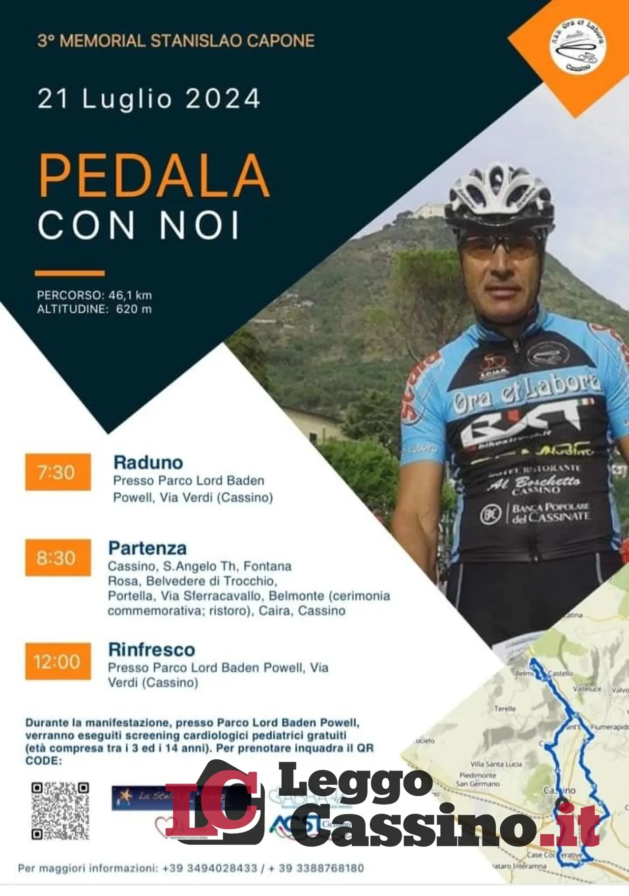 Si terrà domenica 21 luglio l' evento "Pedala con noi" il terzo Memorial Stanislao Capone. Il raduno sara' presso il Parco Baden Powell di Cassino alle ore 7.30.