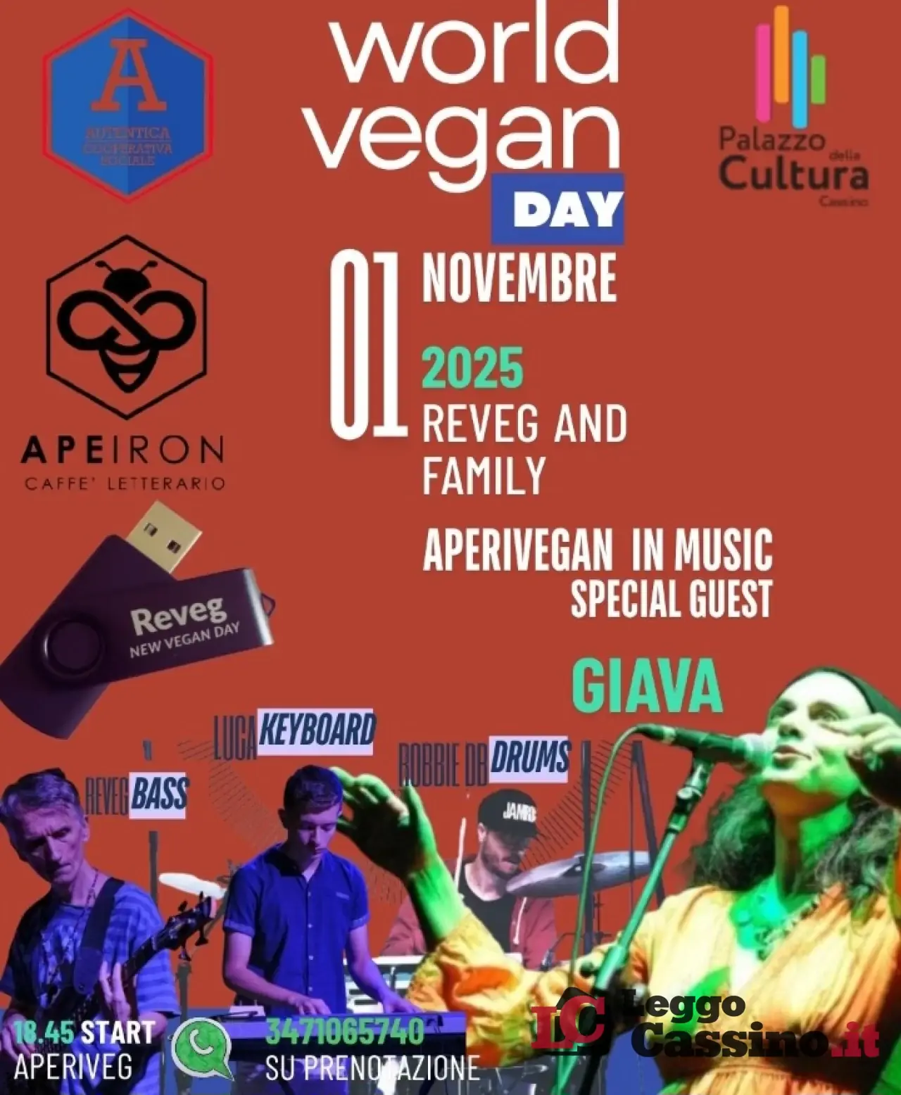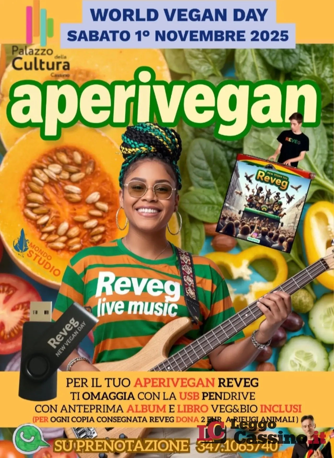 Si terrà il 1° novembre a Cassino presso il Palazzo della Cultura l’evento : “World vegan day” con ReVeg and family, ideato da Antonio Lanni. Ospiti speciali Giava vocalist esperta e Robbie DB. “Giornata dedicata ad etica animalista – spiega Antonio Lanni - con donazione ReVeg a rifugi per animali in Italia. Con omaggi e gadget di album musicale new vegan day e libro Veg&bio per chi aderisce ad Aperivegan dalle 18.30 in poi. Su prenotazione per posti limitati”.