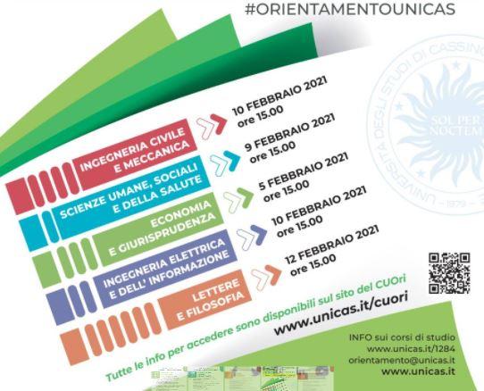 Nuovo anno e dunque tempo di nuovi eventi di orientamento: in arrivo gli open day di Dipartimento dell’Università degli Studi di Cassino e del Lazio Meridionale; in attesa del tradizionale evento di orientamento di Ateneo “Open Day Unicas Orienta/Career Day 2021” programmato in primavera, il Centro Orientamento Universitario in collaborazione con i docenti delegati del centro Orientamento nei cinque dipartimenti dell’Ateneo, ha organizzato da venerdì 5 sino al 12 febbraio, l’open week dei Dipartimenti.