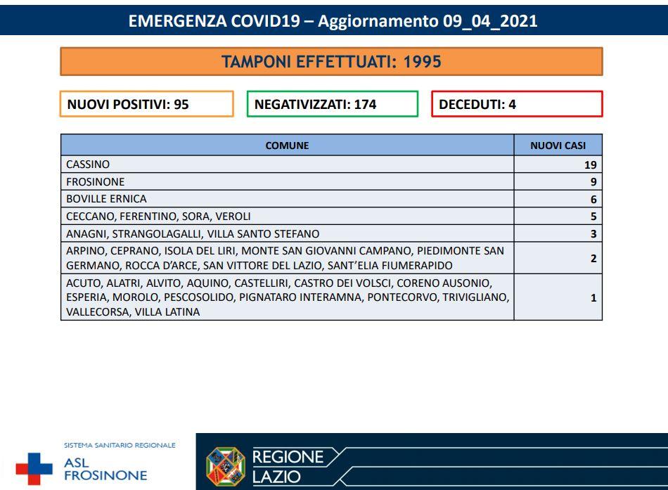 Nella giornata di ieri, 8 aprile, sono stati effettuati 1995 tamponi. In Ciociaria la percentuale tra test processati e nuovi casi scende al 5%: si registrano infatti 95 nuovi casi positivi e i negativizzati sono stati 174. In testa alla classifica ancora Cassino: 20 casi tra ieri (21 positivi) e oggi (19 contagiati).