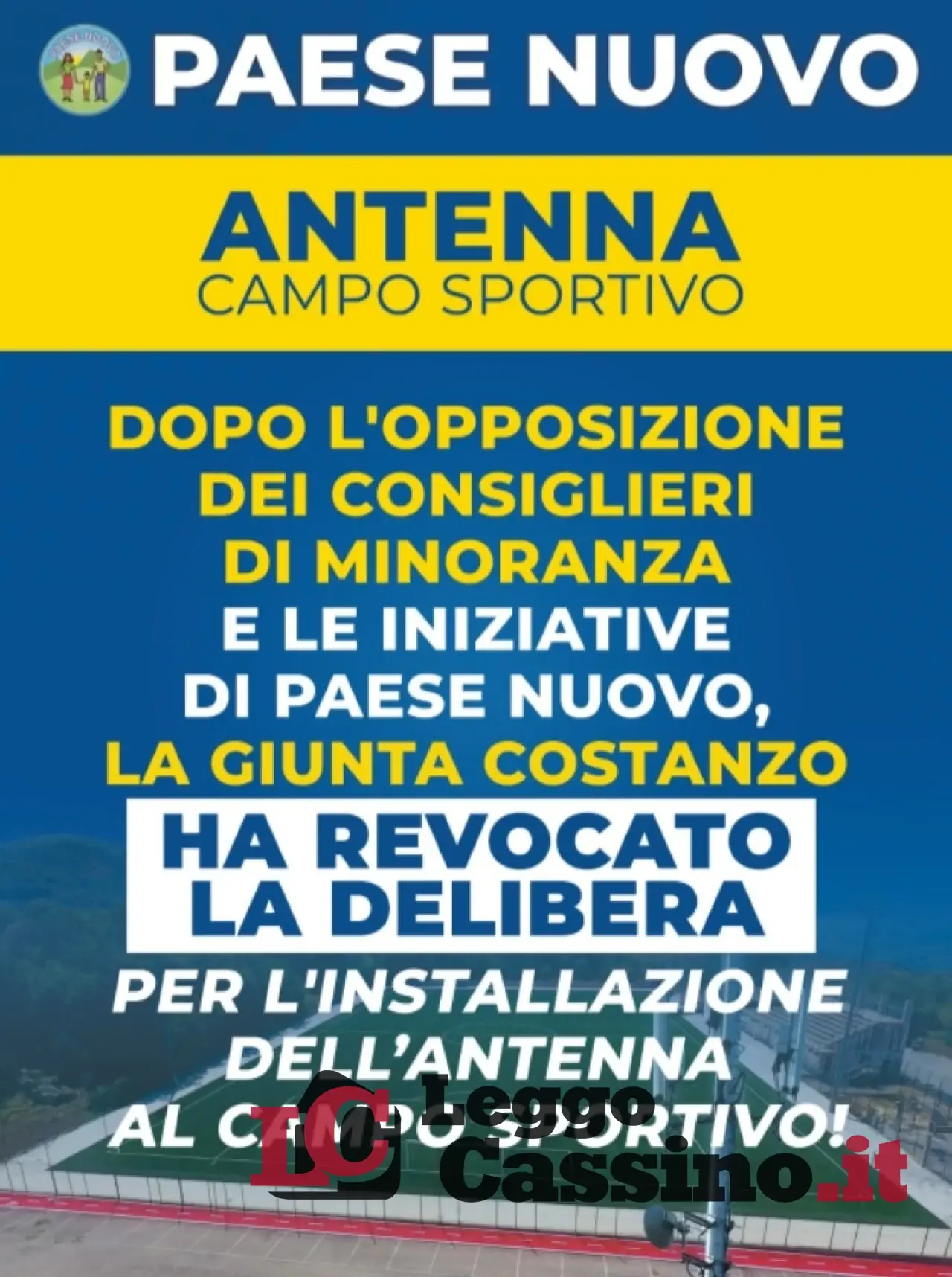 Dopo l'opposizione del Gruppo “Paese Nuovo” e le diverse iniziative messe in campo, l’Amministrazione Costanzo fa retromarcia sull’installazione della Stazione Radio per le telecomunicazioni autorizzata nel parcheggio del Campo Sportivo “Antonio Ruggiero”, con la revoca della delibera n. 126 del 25-10-2024.