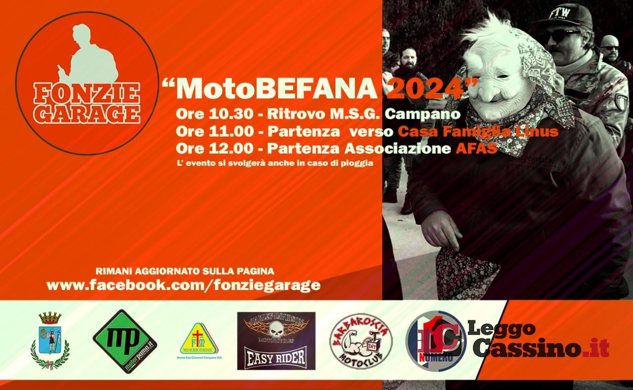 Per il secondo anno, la pagina www.facebook.com/fonziegarage organizza il motobefana. Il mondo dei biker, viene spesso accostato a birra, spogliarelli e musica rock. L'esperienza che offre il nostro gruppo è altamente rivolta al sociale e fortemente indirizzato a famiglie, appassionati, bambini e sopratutto ai meno fortunati. Regalare un sorriso ai bambini, ospiti delle case di accoglienza è la massima gratificazione per noi tutti. In ogni condizione climatica, freddo, neve, acqua, ogni anno, decine di moto partono alla volta delle case dei piccoli ospiti  capitanati da una Harley Davidson guidata da un nostro membro travestito da befana.
