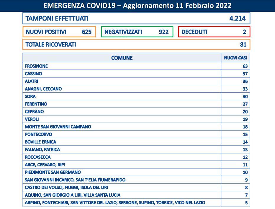 Sono 625 i nuovi casi positivi oggi in provincia di Frosinone. Cala il numero dei tamponi, poco più di 4.000, e di conseguenza anche quello dei contagi: poco più di 600. Stabile a 81 il numero dei ricoverati. Registrati tre decessi: un uomo di 95 anni residente ad Isola del Liri e una donna di 84 anni residente a Sora, entrambi con pregresse patologie.