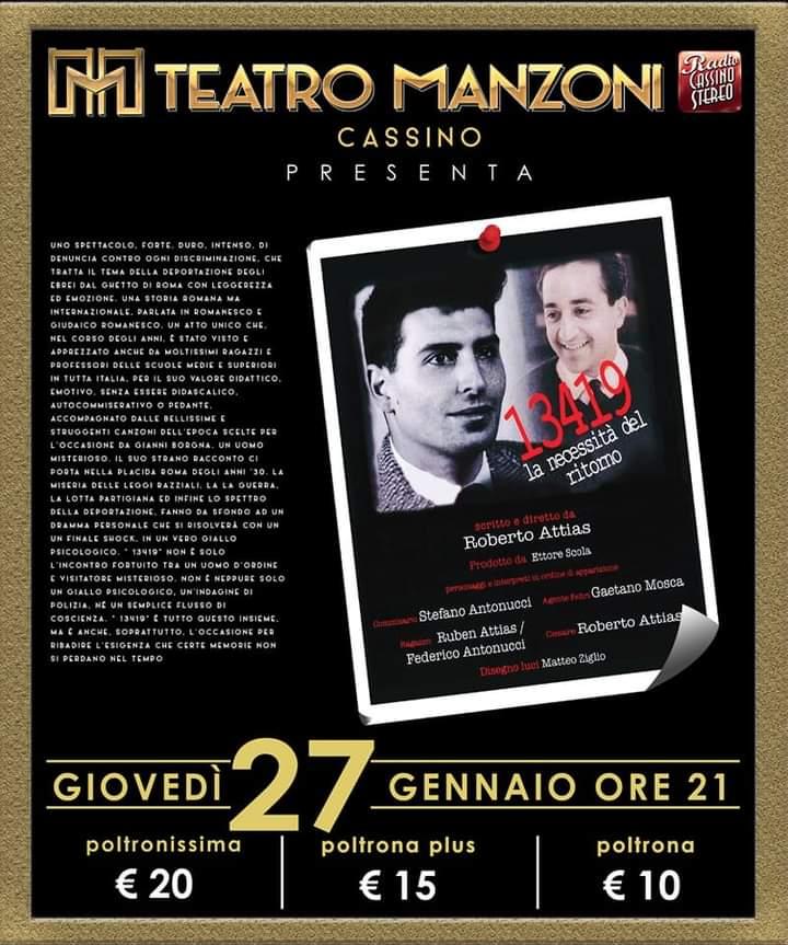 Sempre domani, 27 gennaio al Teatro Manzoni di Cassino alle ore 21 andrà in scena 13419 - La necessità del ritorno: uno spettacolo scritto ed interpretato da Roberto Attias e prodotto da Ettore Scola.