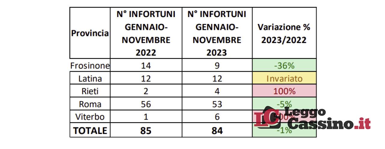 La zona bianca, quella in cui si trova il Lazio, è la zona che raggruppa le regioni con l’incidenza di mortalità sul lavoro tra le meno elevate a livello nazionale. E a fine novembre 2023, il rischio di infortunio mortale in Lazio (23,3 morti per milione di occupati) risulta ben inferiore rispetto alla media nazionale pari a 32,3.