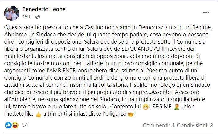 Intanto dall'opposizione si leva la voce del consigliere Benedetto Leone che al termine del Consiglio scrive quanto segue: