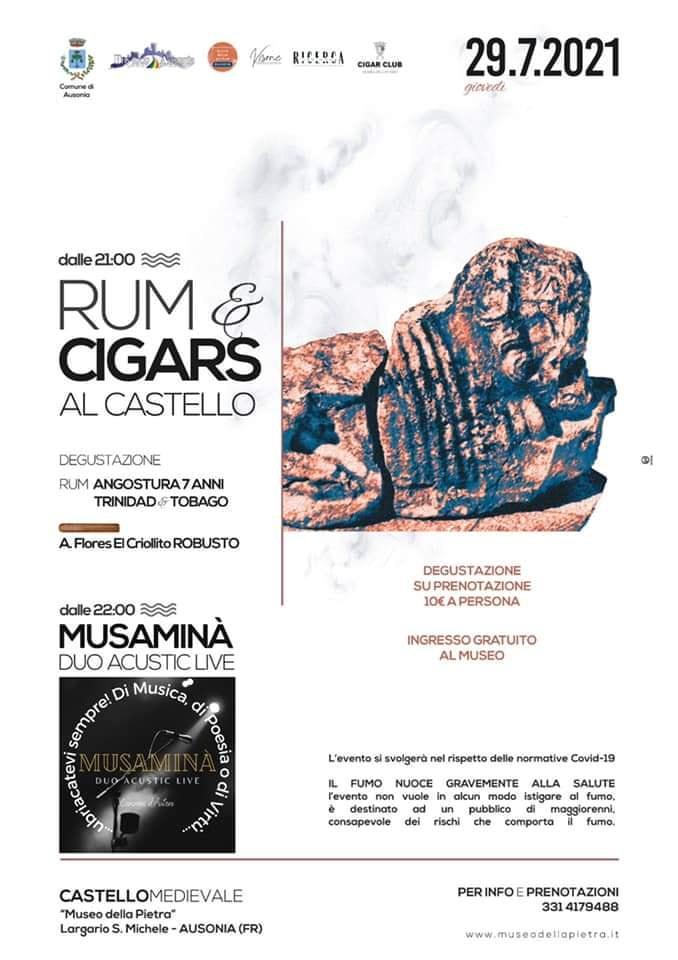 L'appuntamento è per giovedì 29 luglio. La location è il castello di Ausonia. L'iniziativa ha il patrocinio dell'amministrazione comunale, con tanto di logo del Comune Ad Ausonia. A partire dalle ore 21 degustazione su prenotazione. Al castello va in scena l'iniziativa "Rum e sigari".