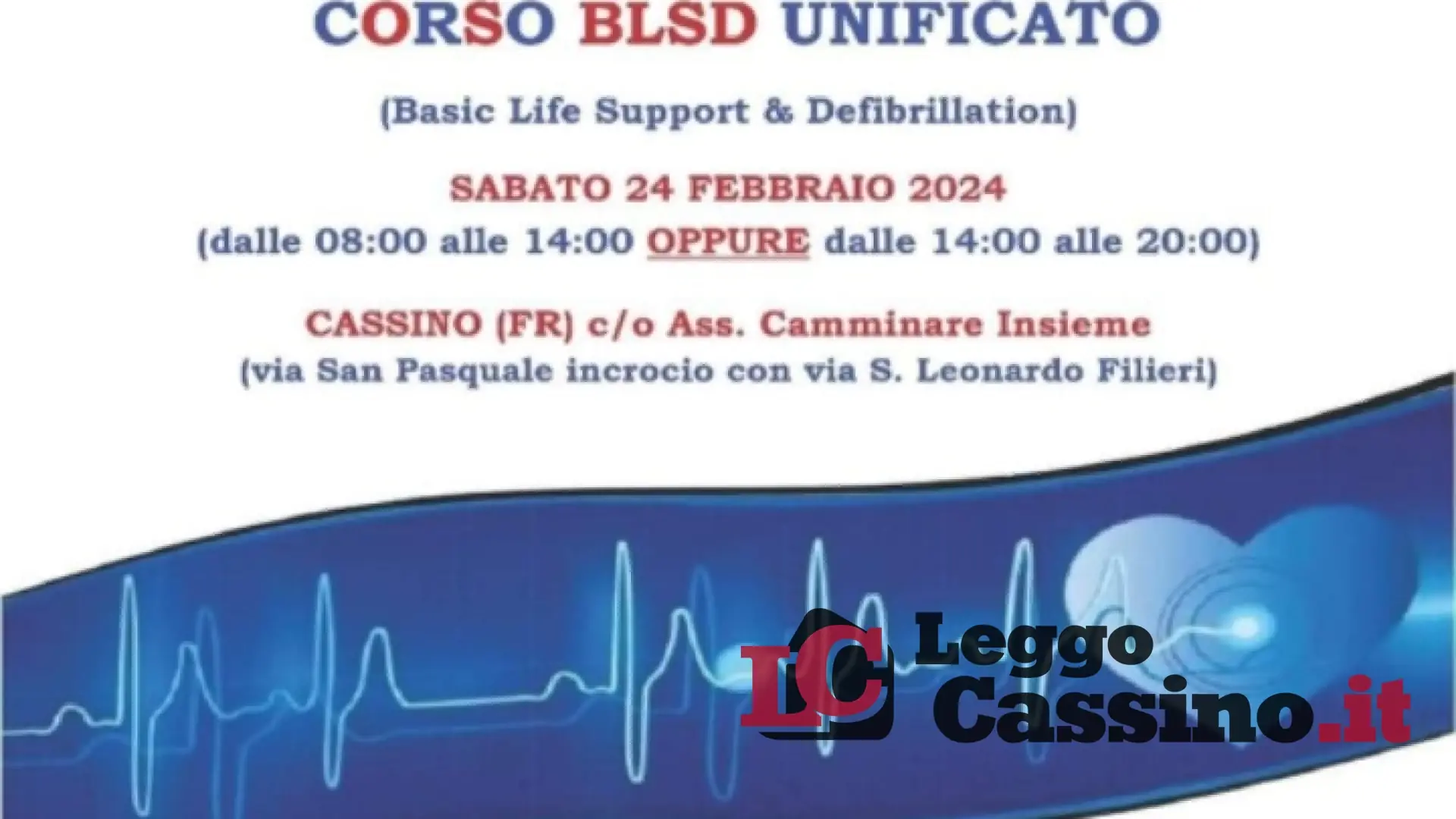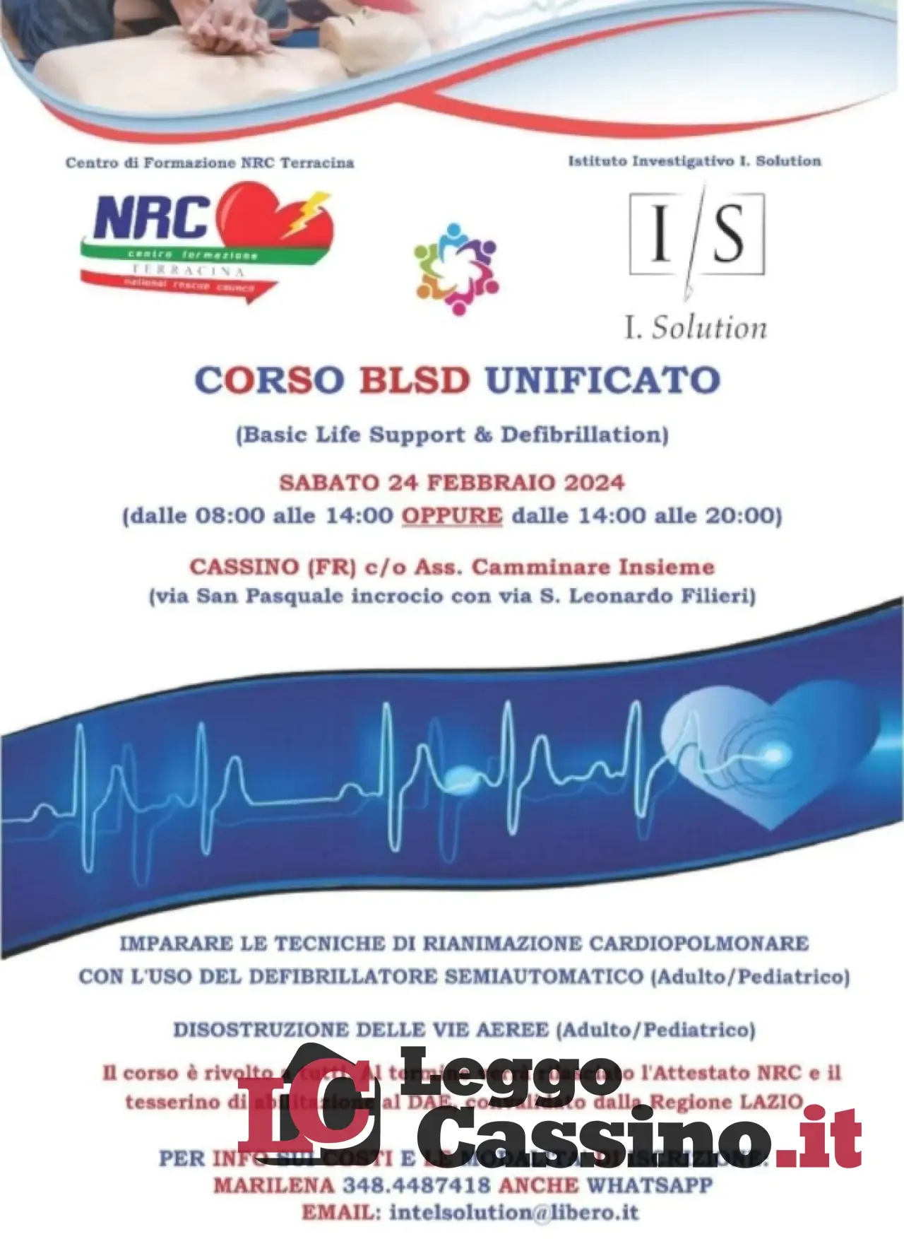 Si terrà sabato 24 febbraio il Corso BLSD Unificato (Basic Live Support & Defibrillation) a Cassino presso l’Associazione “Camminare Insieme” in via San Pasquale incrocio con via S. Leonardo Filieri, dalle ore 8 alle ore 14 oppure dalle ore 14 alle ore 20 (si può scegliere la fascia oraria). E’ necessaria l'iscrizione richiedendo il modulo al numero 3484487418 in quanto i posti sono limitati.