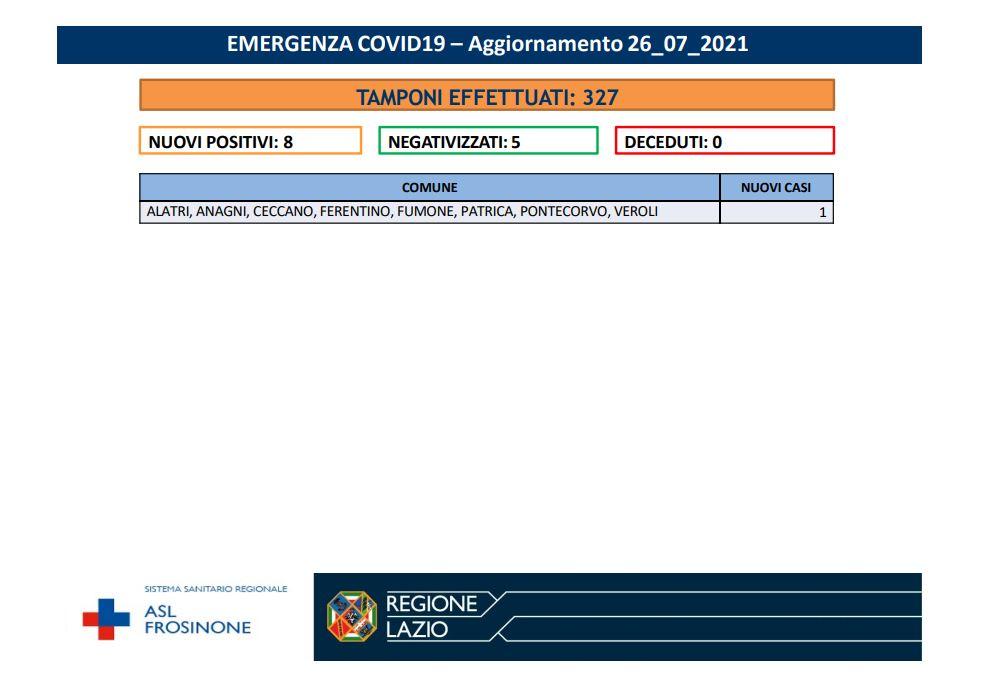 Questi i numeri di oggi comunicati dalla Asl di Frosinone: " Nelle ultime 24h sono stati effettuati 327 tamponi in provincia di Frosinone. Abbiamo registrato 8 nuovi casi di positivi al Sars-CoV-2.