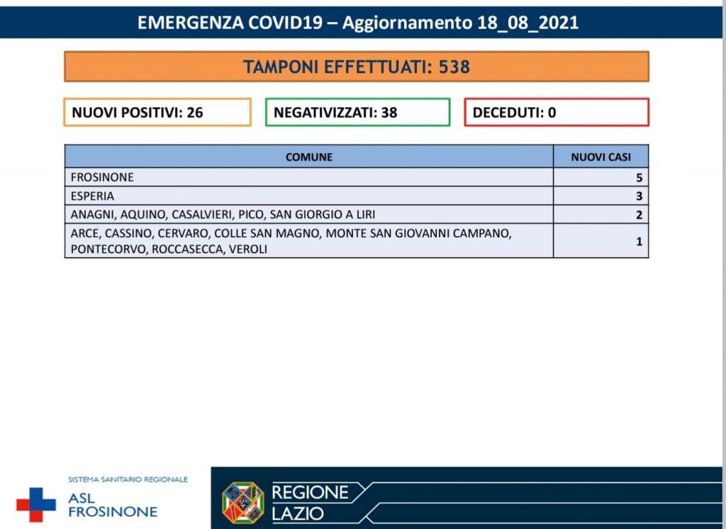 Nelle ultime 24 ore sono stati eseguiti 538 tamponi in provincia di Frosinone. "Abbiamo registrato 26 nuovi casi di positivi al SARS-CoV-2, sono 38 i negativizzati e non abbiamo registrato decessi" comunica la Asl nel consueto bollettino giornaliero.
