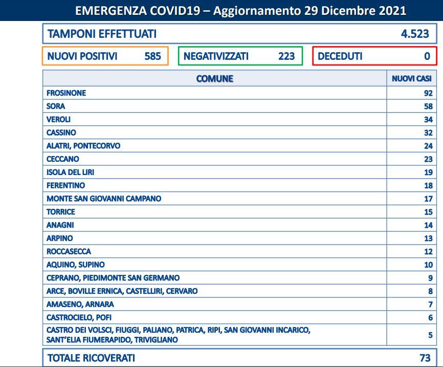 Sono 585 i nuovi casi in provincia di Frosinone. Numeri da brividi. Altri Comuni che hanno riportato nuovi casi oltre a quelli elencati in tabella sono: Fontana Liri, Villa Santa Lucia (4 casi); Morolo, San Giorgio a Liri, San Vittore del Lazio, Vallecorsa (3 casi); Ausonia, Belmonte Castello, Casalvieri, Castelnuovo Parano, Colfelice, Coreno Ausonio, Esperia, Piglio, San Donato Val di Comino, Sgurgola, Vico nel Lazio (2 casi); Alvito, Colle San Magno, Fontechiari, Fumone, Guarcino, Pescosolido, Rocca d'Arce, San Biagio Saracinisco, Sant'Andrea del Garigliano, Sant'Apollinare, Santopadre, Strangolagalli, Trevi nel Lazio, Vicalvi, Villa Latina, Villa Santo Stefano (1 caso).
