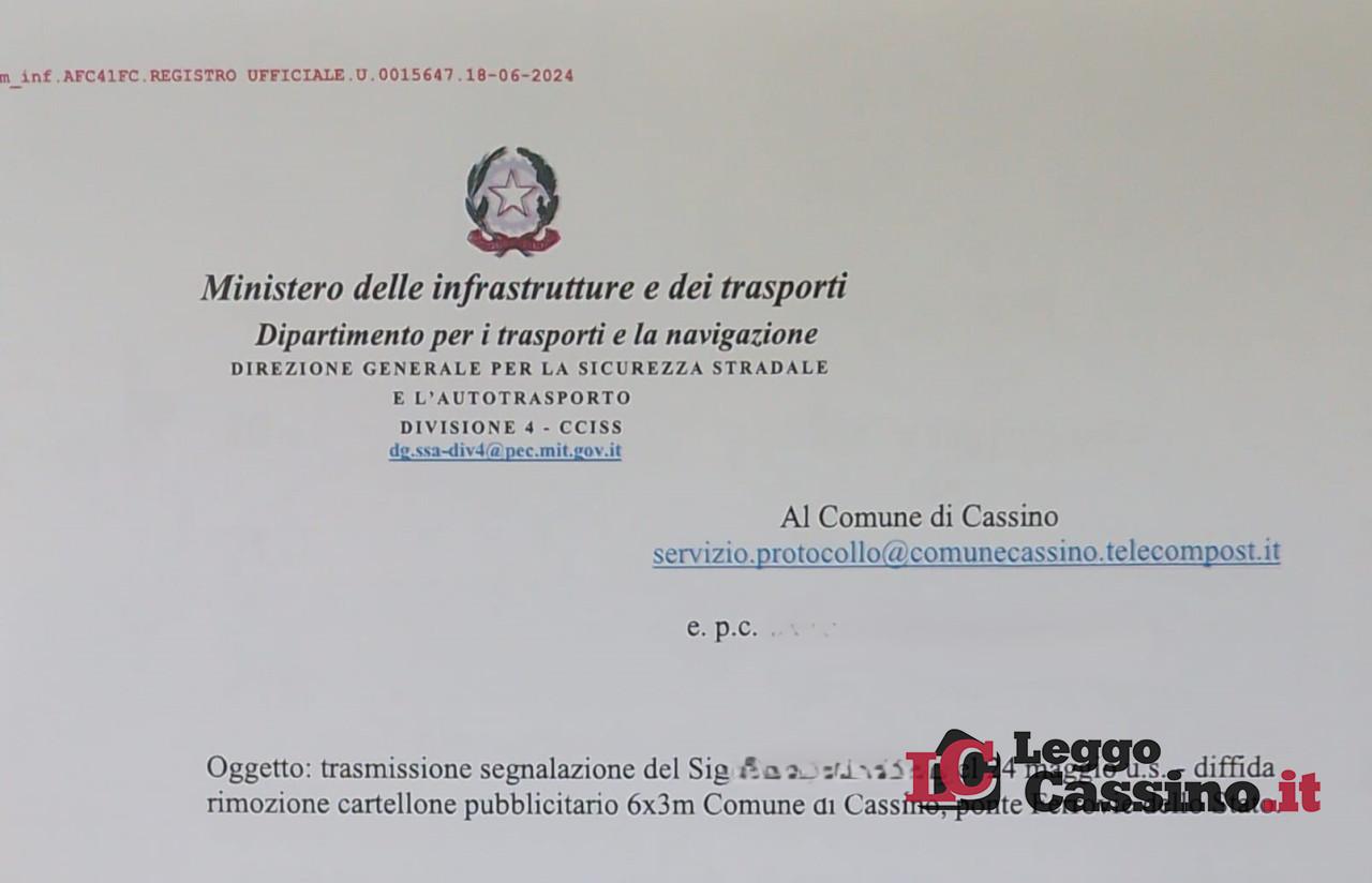 Pubblicità abusiva, noto imprenditore di Cassino pronto a presentare un esposto alla Procura della Repubblica di Cassino per veder riconosciuti i proprio diritti dal momento che un impianto abusivo collocato sul ponte della ferrovia non viene eliminato. Dopo la diffida presentata nei giorni scorsi, anche il Ministero dà ragione all'imprenditore e invita il Comune ad attivarsi. Ecco la nota giunta nelle scorse ore: